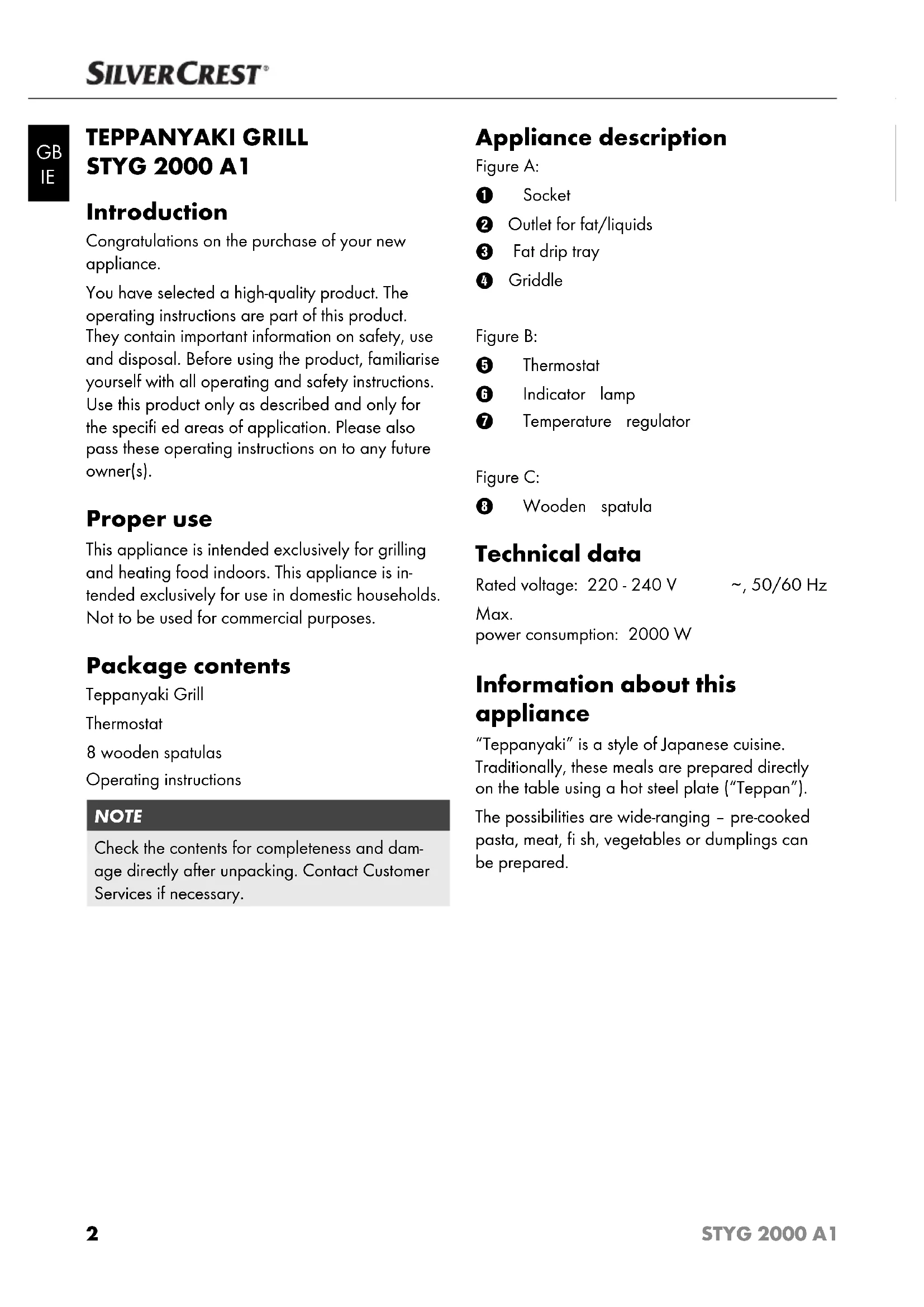 TEPPANYAKI GRILL STYG 2000 A1 Introduction Congratulations on the purchase of your new appliance. You have selected a high-quality product. The operating instructions are part of this product. They contain important information on safety, use and disposal. Before using the product, familiarise yourself with all operating and safety instructions. Use this product only as described and only for the specifi ed areas of application. Please also pass these operating instructions on to any future owner(s). Proper use This appliance is intended exclusively for grilling and heating food indoors. This appliance is in- tended exclusively for use in domestic households. Not to be used for commercial purposes. Package contents Teppanyaki Grill Thermostat 8 wooden spatulas Operating instructions NOTE Check the contents for completeness and dam- age dir ectly after unpacking. Contact Customer Services if necessary. Appliance description Figure A: 1 Socket 2 Outlet for fat/liquids