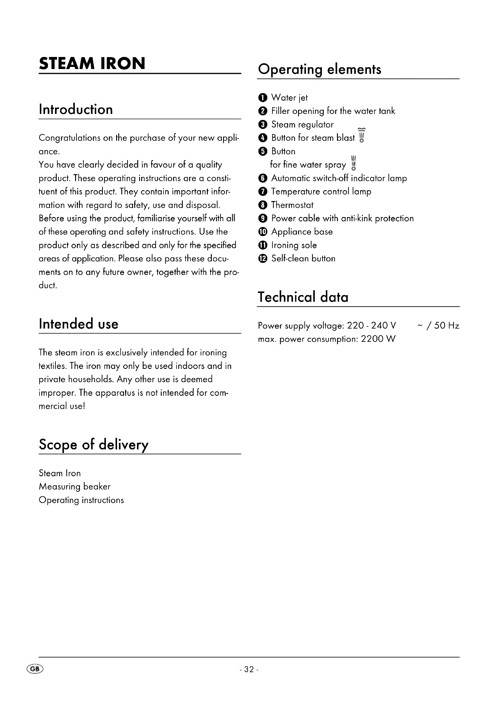 - The steam iron is defective. Arrange for the steam iron to be repaired by qualified specialists. Disposal Do not dispose of the appliance in your normal domestic waste. This appliance is subject to the provisions of European Directive 2002/96/EC. Dispose of the appliance through an approved dis- posal centre or at your community waste facility. Observe the currently applicable regulations. In case of doubt, please contact your waste disposal centre. Dispose of all packaging materials in an environmentally friendly manner.- 40 - Warranty and service The warranty for this appliance is for 3 years from the date of purchase. The appliance has been ma- nufactured with care and meticulously examined before delivery. Please retain your receipt as proof of purchase. In the event of a warranty claim, please telephone our Service Department. This is the only way to ensure that your goods are dispatched free of charge. The warranty only covers claims for material and manufacturing defects, but not for transport damage, wearing parts or damage to fragile components such as buttons or batteries. This product is for private use only and is not intended for commercial use. The warranty is void in the case of incorrect and im- proper handling, use of force and internal manipula- tion that is not carried out by our authorised service branch. Your statutory rights are not restricted in any way by this warranty. The warranty period will not be extended by repairs made under warranty. This also applies to replaced and repaired parts. Any damage and defects that are discovered immediately after purchase must be reported immediately after unpacking the applian- ce, no more than two days after the purchase date. Repairs made after the expiration of the warranty period are subject to payment. Service Great Britain Tel.: 0871 5000 720 (£ 0.10/Min.) E-mail: kompernass@lidl.co.uk Importer KOMPERNASS GMBH BURGSTRASSE 21 44867 BOCHUM, GERMANY www.kompernass.com IAN 85032 IB_85032_SDB2200C1_CH.qxp 11.12.2012 14:25 Uhr Seite 40IAN 85032 KOMPERNASS GMBH Burgstraße 21 D-44867 Bochum www.kompernass.com Stand der Informationen · Version des informations Versione delle informazioni · Last Information Update: 12 / 2012 · Ident.-No.: SDB2200C1102012-2