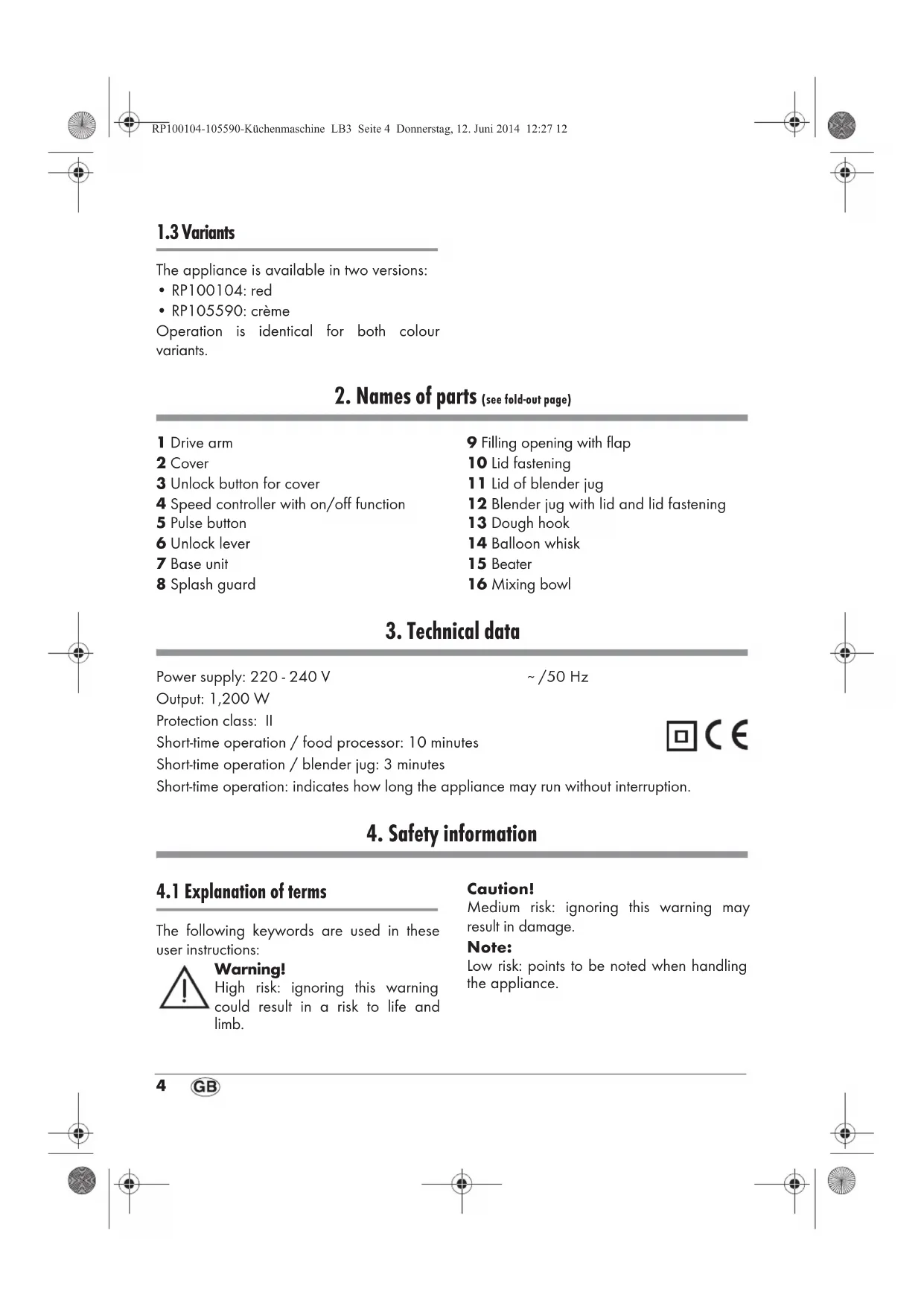 The following keywords are used in these user instructions: Warning! High risk: ignoring this warning could result in a risk to life and limb. Caution! Medium risk: ignoring this warning may result in damage. Note: Low risk: points to be noted when handling the appliance. RP100104-105590-Küchenmaschine LB3 Seite 4 Donnerstag, 12. Juni 2014 12:27 12SKMP 1200 A2 5