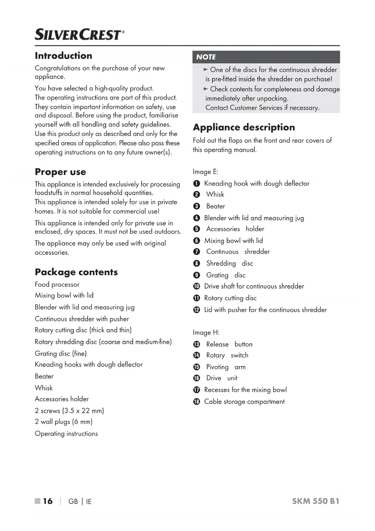 They contain important information on safety, use and disposal. Before using the product, familiarise yourself with all handling and safety guidelines. Use this product only as described and only for the specified areas of application. Please also pass these operating instructions on to any future owner(s). Proper use This appliance is intended exclusively for processing foodstuffs in normal household quantities. This appliance is intended solely for use in private homes. It is not suitable for commercial use! This appliance is intended only for private use in enclosed, dry spaces. It must not be used outdoors. The appliance may only be used with original accessories. Package contents Food processor Mixing bowl with lid Blender with lid and measuring jug Continuous shredder with pusher Rotary cutting disc (thick and thin) Rotary shredding disc (coarse and medium-fine) Grating disc (fine) Kneading hooks with dough deflector Beater Whisk Accessories holder 2 screws (3.5 x 22 mm) 2 wall plugs (6 mm) Operating instructions NOTE ► One of the discs for the continuous shredder is pre-fitted inside the shredder on purchase! ► Check contents for completeness and damage immediately after unpacking. Contact Customer Services if necessary. Appliance description Fold out the flaps on the front and rear covers of this operating manual. Image E: Kneading hook with dough deflector Whisk Beater Blender with lid and measuring jug Accessories holder Mixing bowl with lid Continuous shredder Shredding disc Grating disc Drive shaft for continuous shredder - Rotary cutting disc 3 Lid with pusher for the continuous shredder Image H: ! Release button . Rotary switch 0 Pivoting arm 6 Drive unit 1 Recesses for the mixing bowl % Cable storage compartmentGB
