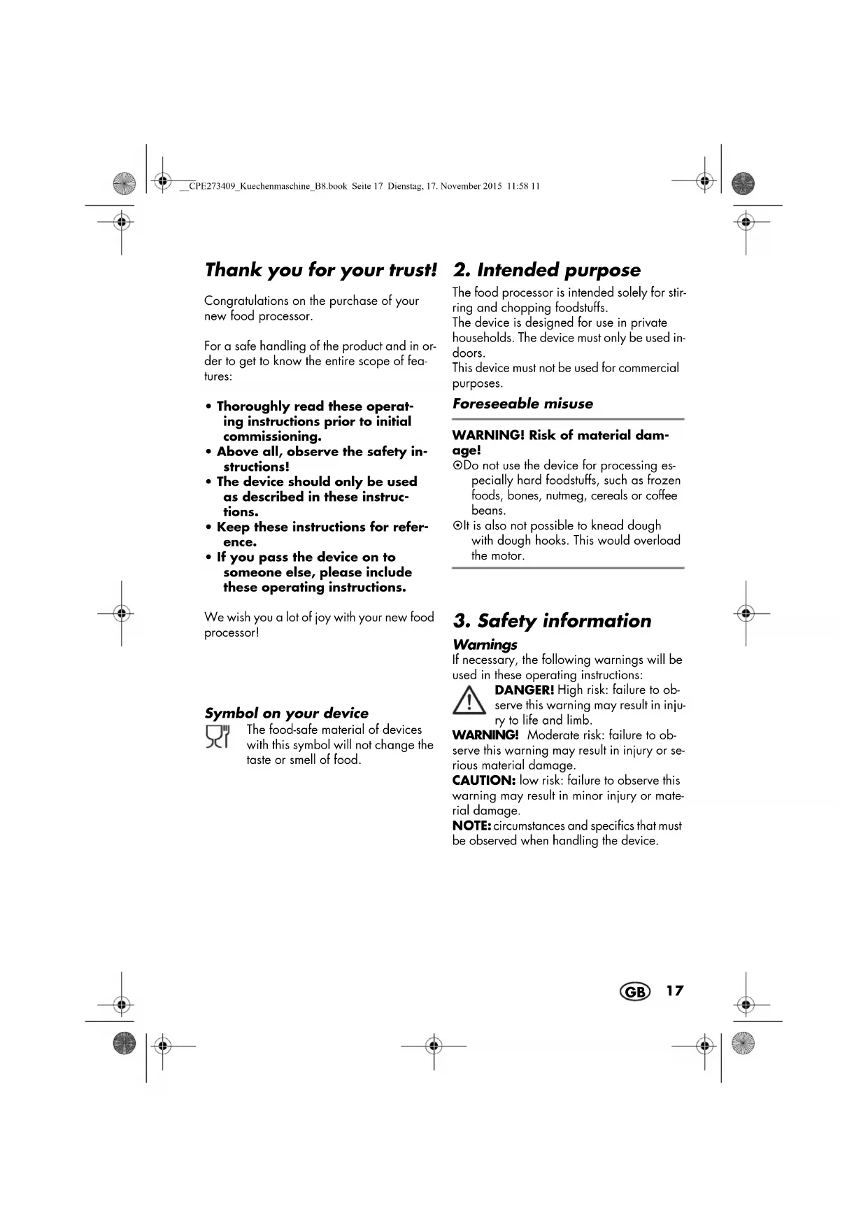 Warnings If necessary, the following warnings will be used in these operating instructions: DANGER! High risk: failure to ob- serve this warning may result in inju- ry to life and limb. WARNING! Moderate risk: failure to ob- serve this warning may result in injury or se- rious material damage. CAUTION: low risk: failure to observe this warning may result in minor injury or mate- rial damage. NOTE: circumstances and specifics that must be observed when handling the device. __CPE273409_Kuechenmaschine_B8.book Seite 17 Dienstag, 17. November 2015 11:58 1118