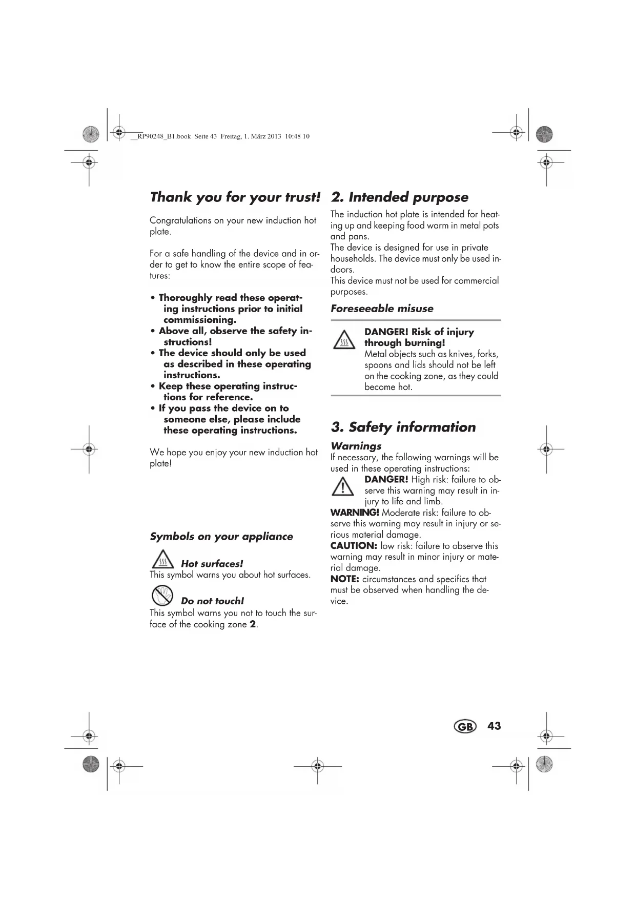 - If you pass the device on to someone else, please include these operating instructions. We hope you enjoy your new induction hot plate! Symbols on your appliance Hot surfaces! This symbol warns you about hot surfaces. Do not touch! This symbol warns you not to touch the sur- face of the cooking zone2.