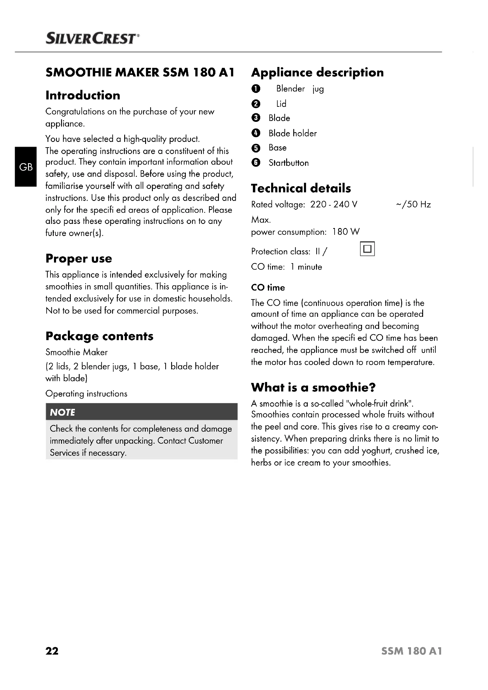 /50 Hz Max. power consumption: 180 W Protection class: II / CO time: 1 minute CO time The CO time (continuous operation time) is the amount of time an appliance can be operated without the motor overheating and becoming damaged. When the specifi ed CO time has been reached, the appliance must be switched off until the motor has cooled down to room temperature. What is a smoothie? A smoothie is a so-called "whole-fruit drink". Smoothies contain processed whole fruits without the peel and core. This gives rise to a creamy con- sistency. When preparing drinks there is no limit to the possibilities: you can add yoghurt, crushed ice, herbs or ice cream to your smoothies. IB_96281_SSM180A1_LB2.indb 22IB_96281_SSM180A1_LB2.indb 22 03.02.14 15:5403.02.14 15:5423 SSM 180 A1