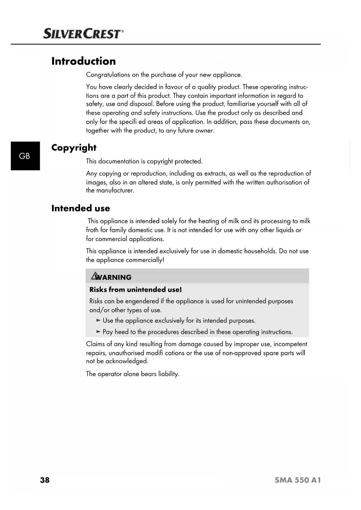 Introduction Congratulations on the purchase of your new appliance. You have clearly decided in favour of a quality product. These operating instruc- tions are a part of this product. They contain important information in regard to safety, use and disposal. Before using the product, familiarise yourself with all of these operating and safety instructions. Use the product only as described and only for the specifi ed areas of application. In addition, pass these documents on, together with the product, to any future owner. Copyright This documentation is copyright protected. Any copying or reproduction, including as extracts, as well as the reproduction of images, also in an altered state, is only permitted with the written authorisation of the manufacturer. Intended use This appliance is intended solely for the heating of milk and its processing to milk froth for family domestic use. It is not intended for use with any other liquids or for commercial applications. This appliance is intended exclusively for use in domestic households. Do not use the appliance commercially! WARNING Risks from unintended use! Risks can be engendered if the appliance is used for unintended purposes and/or other types of use. ► Use the appliance exclusively for its intended purposes. ► Pay heed to the procedures described in these operating instructions. Claims of an y kind resulting from damage caused by improper use, incompetent repairs, unauthorised modifi cations or the use of non-approved spare parts will not be acknowledged. The operator alone bears liability.39 SMA 550 A1