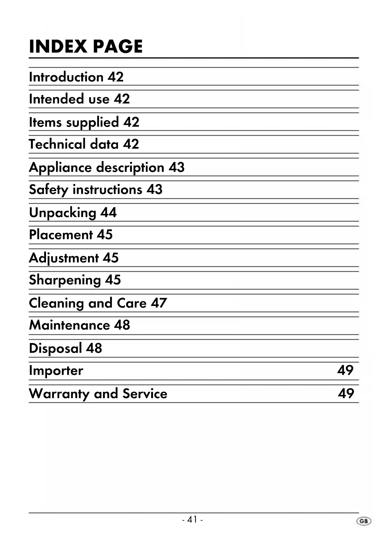 Introduction 42 Intended use 42 Items supplied 42 Technical data 42 Appliance description 43 Safety instructions 43 Unpacking 44 Placement 45 Adjustment 45 Sharpening 45 Cleaning and Care 47 Maintenance 48 Disposal 48 Importer 49 Warranty and Service 49 - 41 -- 42 - Introduction Congratulations on the purchase of your new appliance. You have clearly decided in favour of a quality product. These operating in- structions are a part of this product. They contain important information in re- gard to safety, use and disposal. Before using the product, familiarise yourself with all of these operating and safety instructions. Use the product only as de- scribed and only for the specified areas of application. In addition, pass the- se documents on, together with the product, to any future owner. Intended use This appliance is intended for the sharpening of knives, screwdrivers and scissors in domestic households. This appliance is not intended for commercial or in- dustrial applications. Items supplied 1 x Electric All-Purpose Sharpener 1 x Operating Instructions Technical data Power consumption : 20 W max. Mains voltage: 230 V