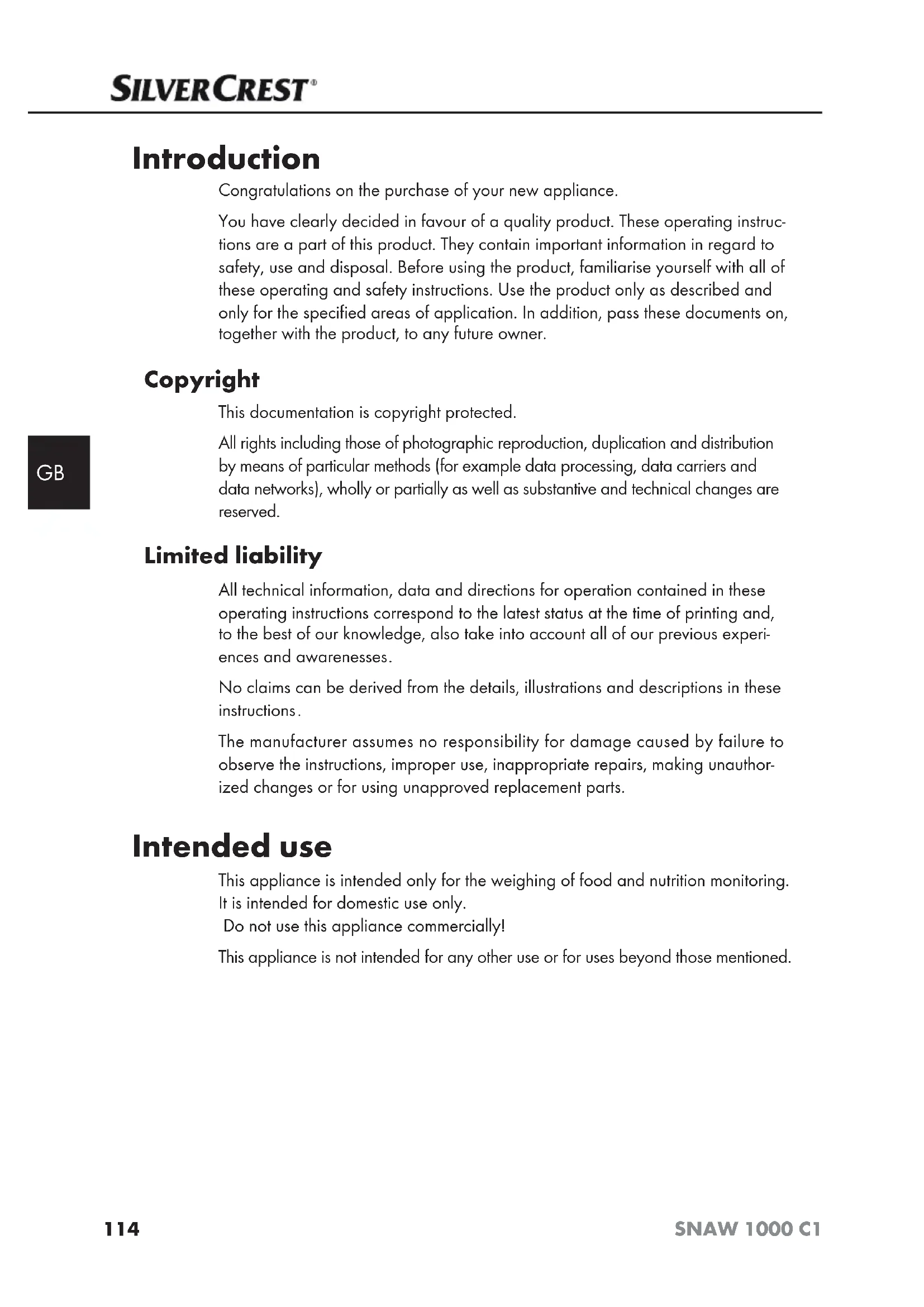 The manufacturer assumes no r esponsibility for damage caused by failure to observe the instructions, improper use, inappropriate repairs, making unauthor- ized changes or for using unapproved replacement parts. Intended use This appliance is intended only for the weighing of food and nutrition monitoring. It is intended for domestic use only. Do not use this appliance commercially! This appliance is not intended for any other use or for uses beyond those mentioned.115