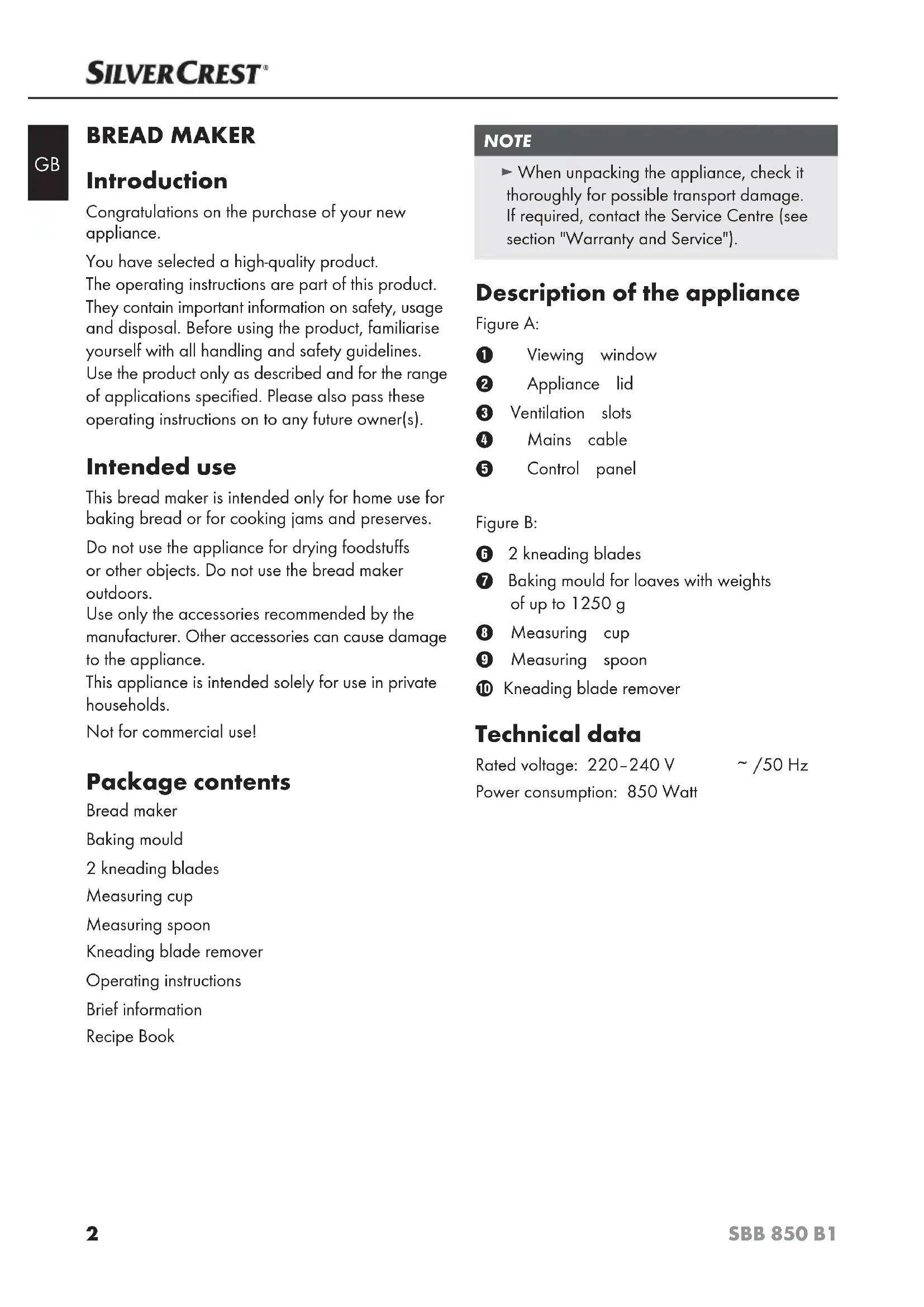 BREAD MAKER Introduction Congratulations on the purchase of your new appliance. You have selected a high-quality product. The operating instructions are part of this product. They contain important information on safety, usage and disposal. Before using the product, familiarise yourself with all handling and safety guidelines. Use the product only as described and for the range of applications specified. Please also pass these operating instructions on to any future owner(s). Intended use This bread maker is intended only for home use for baking bread or for cooking jams and preserves. Do not use the appliance for drying foodstuffs or other objects. Do not use the bread maker outdoors. Use only the accessories recommended by the manufacturer. Other accessories can cause damage to the appliance. This appliance is intended solely for use in private households. Not for commercial use! Package contents Bread maker Baking mould 2 kneading blades Measuring cup Measuring spoon Kneading blade remover Operating instructions Brief information Recipe Book NOTE ► When unpacking the appliance, check it thoroughly for possible transport damage. If required, contact the Service Centre (see section "Warranty and Service"). Description of the appliance Figure A: Viewing window Appliance lid Ventilation slots Mains cable Control panel Figure B: 2 kneading blades Baking mould for loaves with weights of up to 1250 g Measuring cup Measuring spoon Kneading blade remover Technical data Rated voltage: 220–240 V