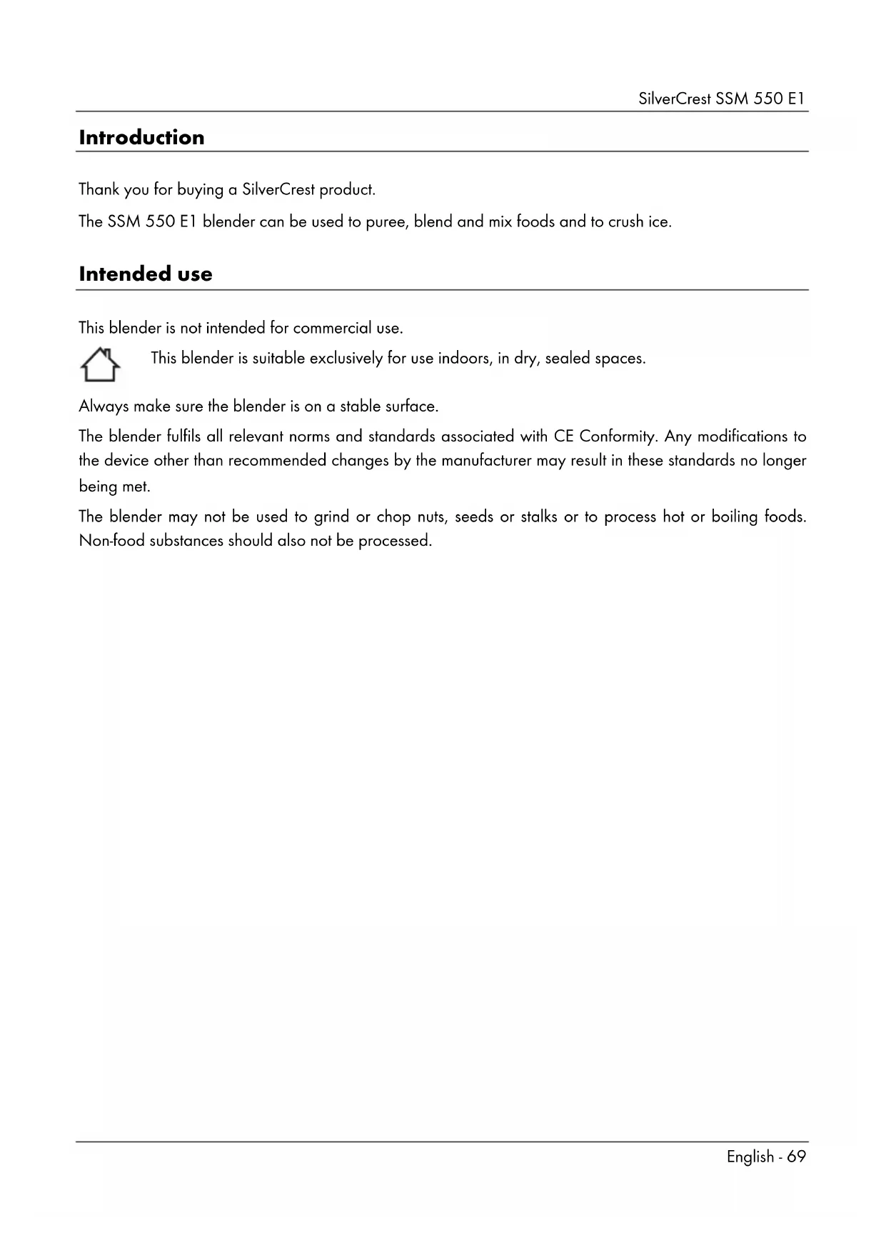 Package contents Motor unit with power cord and plug Blender jug with cutting blade Measuring cap Lid This user manual Controls These operating instructions have a fold-out cover. On the inside of the cover, the blender is shown with figures indicated. The meanings of the numbers are as follows: 1 Measuring cap 2 Lid 3 Blender jug with scale and cutting blade 4 Rotary switch 5 Power cord 6 Motor unit 7 Cord wrap (on the underside of the motor unit)SilverCrest SSM 550 E1 English - 71 Technical specifications Manufacturer: SilverCrest Model name: SSM 550 E1 Operating voltage: 220 - 240 V, 50/60 Hz Power: max. 550 W Speed levels: 5 Power cord length: 100 cm Dimensions: approx. 180 x 173 x 438 mm (W x D x H) Weight: approx. 3750g Max. fill level: 1.75 l SO time*: 3 minutes Protection Class II