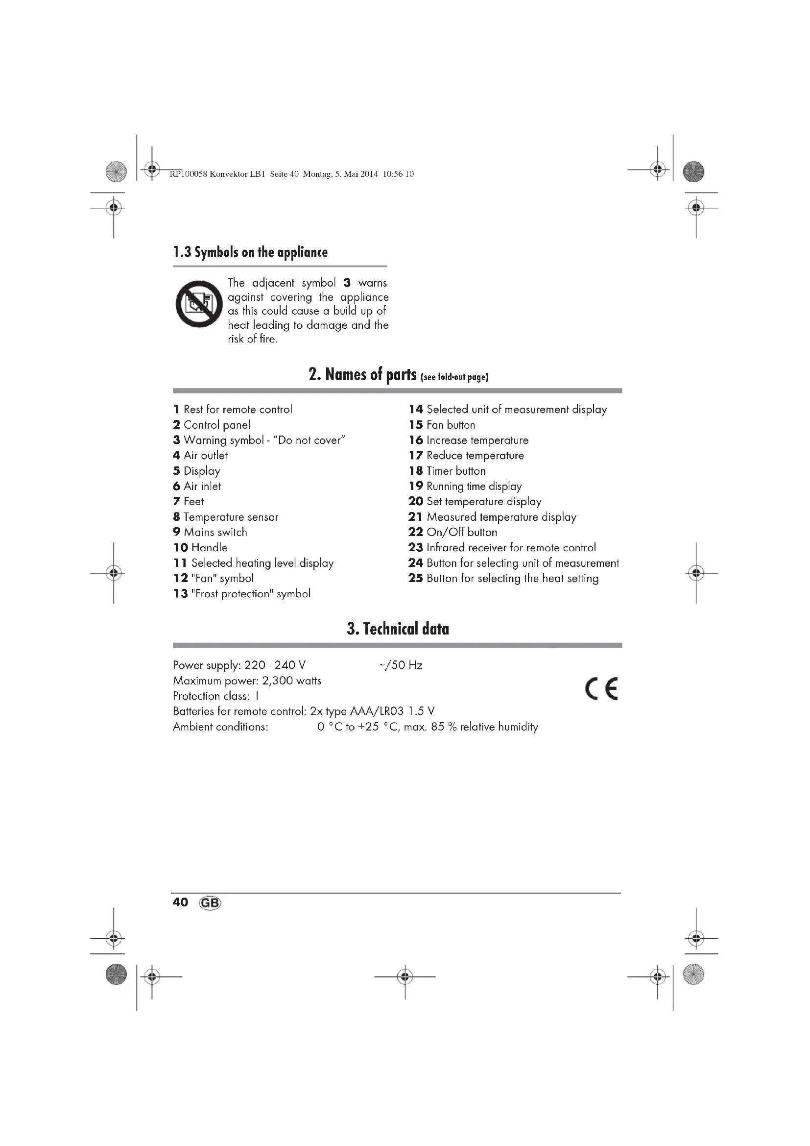 Dear Customer, You have a warranty on this product which is valid for 3 years from the date of purchase. In the event of this product being defective, you have statutory rights against the seller of the product. These statutory rights are not limited by our warranty as set out below. Warranty conditions The warranty period begins with the date of purchase. Please keep the original till receipt in a safe place. This is required as your proof of purchase. If a defect in materials or workmanship occurs within three years of the date your product was purchased, we will repair or replace the product at our discretion at no charge to you. This service under warranty assumes that the defective product and the proof of purchase (till receipt) are submitted within the three-year period and that a brief description in writing is provided of what the defect is and when it occurred. If the defect is covered by our warranty, the repaired product or a new one will be sent back to you. There is no new warranty period following repair or replacement of the product. Warranty period and statutory claims relating to defects The warranty period is not extended when a service is provided under warranty. This also applies to replaced and repaired parts. Any damage or defects present at purchase must be reported immediately the product is unpacked. Repairs incurred once the warranty period has expired are chargeable. Scope of warranty The product has been carefully manufactured in accordance with strict quality guidelines and was thoroughly checked before being delivered. The warranty applies to defective materials or workmanship. This warranty does not extend to product parts exposed to normal wear and tear (and which can therefore be considered wear parts) or to damage to fragile parts such as switches, batteries or parts made of glass. This warranty is void if the product is damaged or if it is not used or maintained properly. All the information in the operating instructions should be observed precisely to ensure that the product is used properly. It is essential to avoid intended uses and actions which are discouraged or warned against in the operating instructions. RP100058 Konvektor LB1 Seite 48 Montag, 5. Mai 2014 10:56 10SKD2300A1 49 The product is intended for only private use and not for commercial purposes. The warranty is void in the event of misuse, incorrect treatment, use of force or interference by anyone other than our authorized service centre. Warranty process Please follow the instructions below to ensure that your claim is processed quickly.