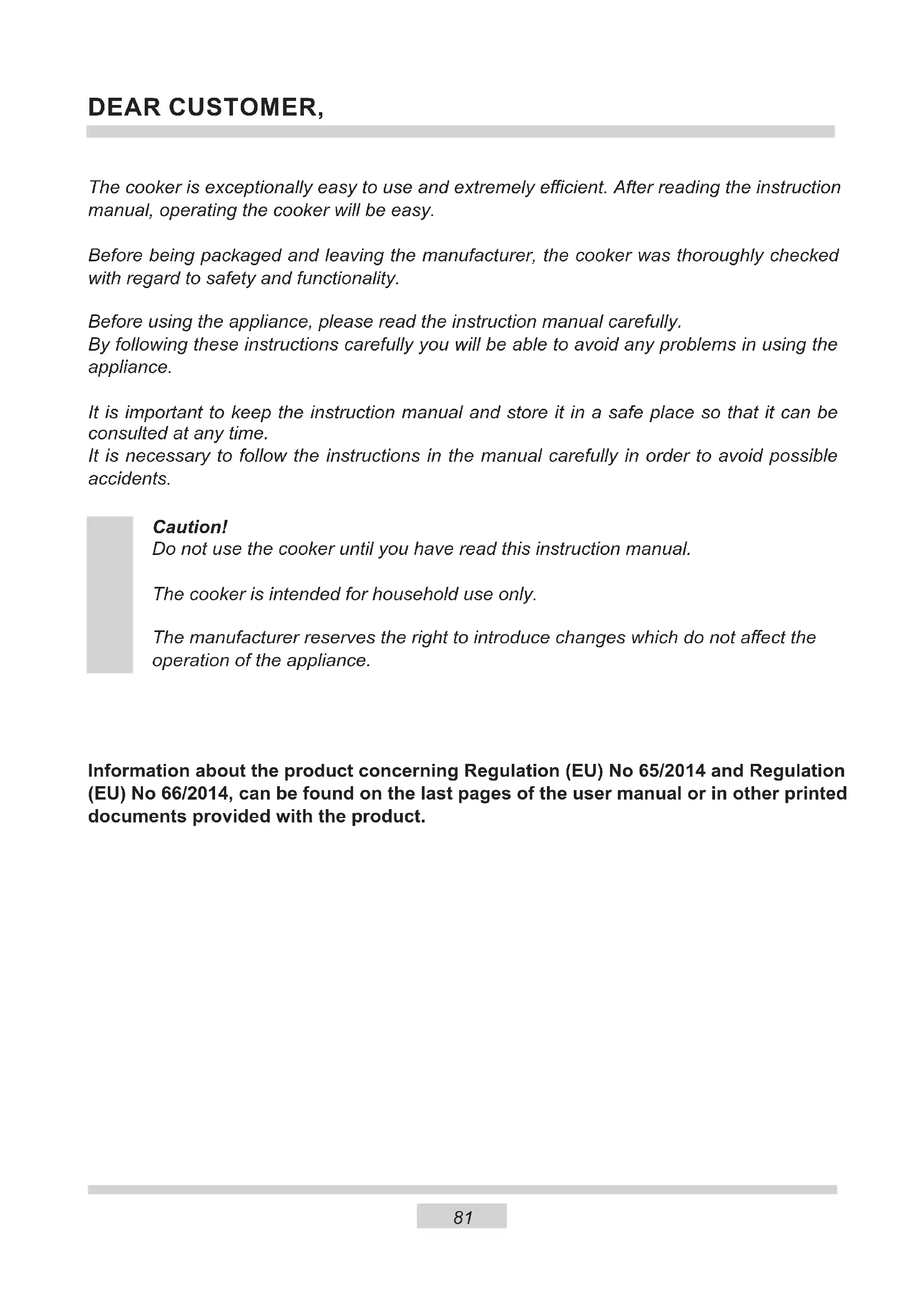 DEAR CUSTOMER, The cooker is exceptionally easy to use and extremely ecient. After reading the instruction manual, operating the cooker will be easy. Before being packaged and leaving the manufacturer, the cooker was thoroughly checked with regard to safety and functionality. Before using the appliance, please read the instruction manual carefully. By following these instructions carefully you will be able to avoid any problems in using the appliance. It is important to keep the instruction manual and store it in a safe place so that it can be consulted at any time. It is necessary to follow the instructions in the manual carefully in order to avoid possible accidents. Caution! Do not use the cooker until you have read this instruction manual. The cooker is intended for household use only. The manufacturer reserves the right to introduce changes which do not aect the operation of the appliance. Information about the product concerning Regulation (EU) No 65/2014 and Regulation (EU) No 66/2014, can be found on the last pages of the user manual or in other printed documents provided with the product.82 SAFETY INSTRUCTIONS