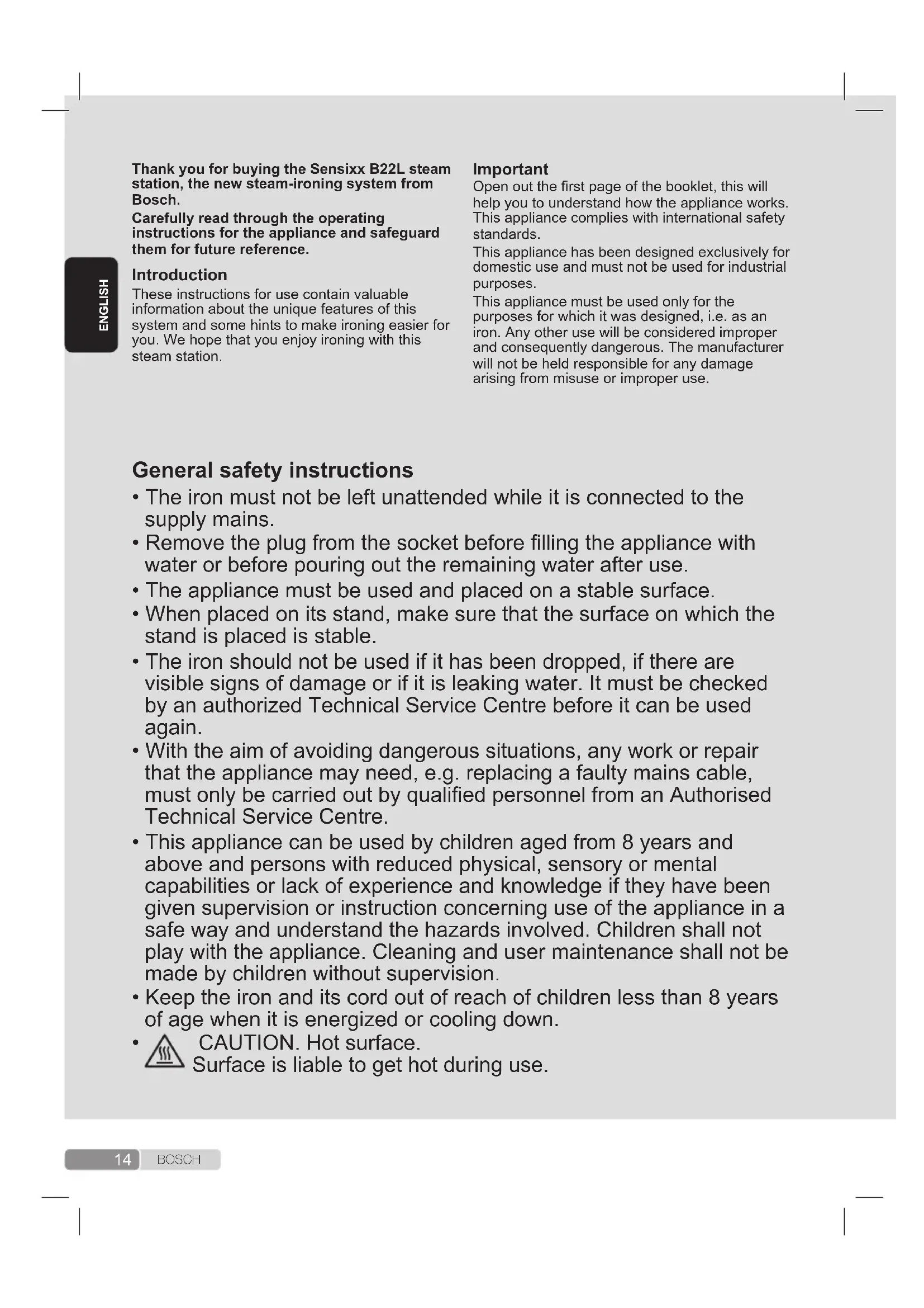 This appliance reaches high temperatures and produces steam during use, this could cause scalds or burns if not used properly. The steam hose, base station, metal plate at the bottom of the removable iron pad (2) and in particular the iron can get hot when used. This is normal. Never aim the steam at people or animals. Do not allow the power cable to come into contact with the soleplate when it is hot. Be aware that the system can keep on steaming for a short additional time after releasing the steam trigger. This is a normal function.15 B O S C H Open out the rst page of the booklet, this will help you to understand how the appliance works. This appliance complies with international safety standards. This appliance has been designed exclusively for domestic use and must not be used for industrial purposes. This appliance must be used only for the purposes for which it was designed, i.e. as an iron. Any other use will be considered improper and consequently dangerous. The manufacturer will not be held responsible for any damage arising from misuse or improper use.