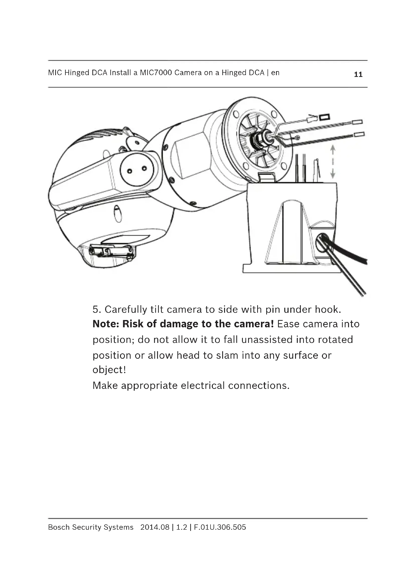 en | Install a MIC7000 Camera on a Hinged DCA MIC Hinged DCA 2014.08 | 1.2 | F.01U.306.505 Bosch Security Systems5. Carefully tilt camera to side with pin under hook. Note: Risk of damage to the camera! Ease camera into position; do not allow it to fall unassisted into rotated position or allow head to slam into any surface or object! Make appropriate electrical connections. MIC Hinged DCA Install a MIC7000 Camera on a Hinged DCA | en