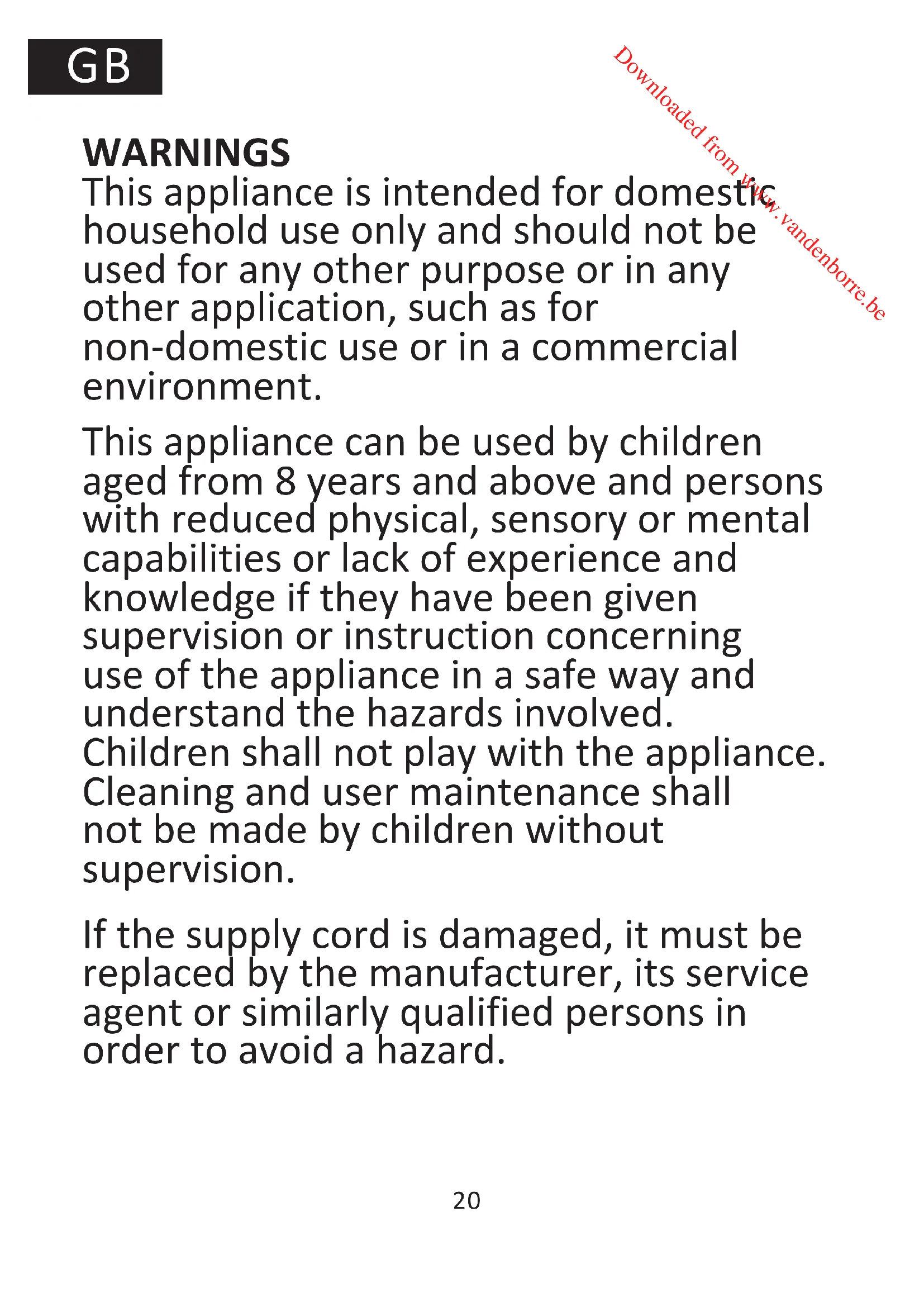 WARNINGS This appliance is intended for domestic household use only and should not be used for any other purpose or in any other application, such as for non-domestic use or in a commercial environment. This appliance can be used by children aged from 8 years and above and persons with reduced physical, sensory or mental capabilities or lack of experience and knowledge if they have been given supervision or instruction concerning use of the appliance in a safe way and understand the hazards involved. Children shall not play with the appliance. Cleaning and user maintenance shall not be made by children without supervision. If the supply cord is damaged, it must be replaced by the manufacturer, its service agent or similarly qualified persons in order to avoid a hazard. Downloaded from www.vandenborre.beGB