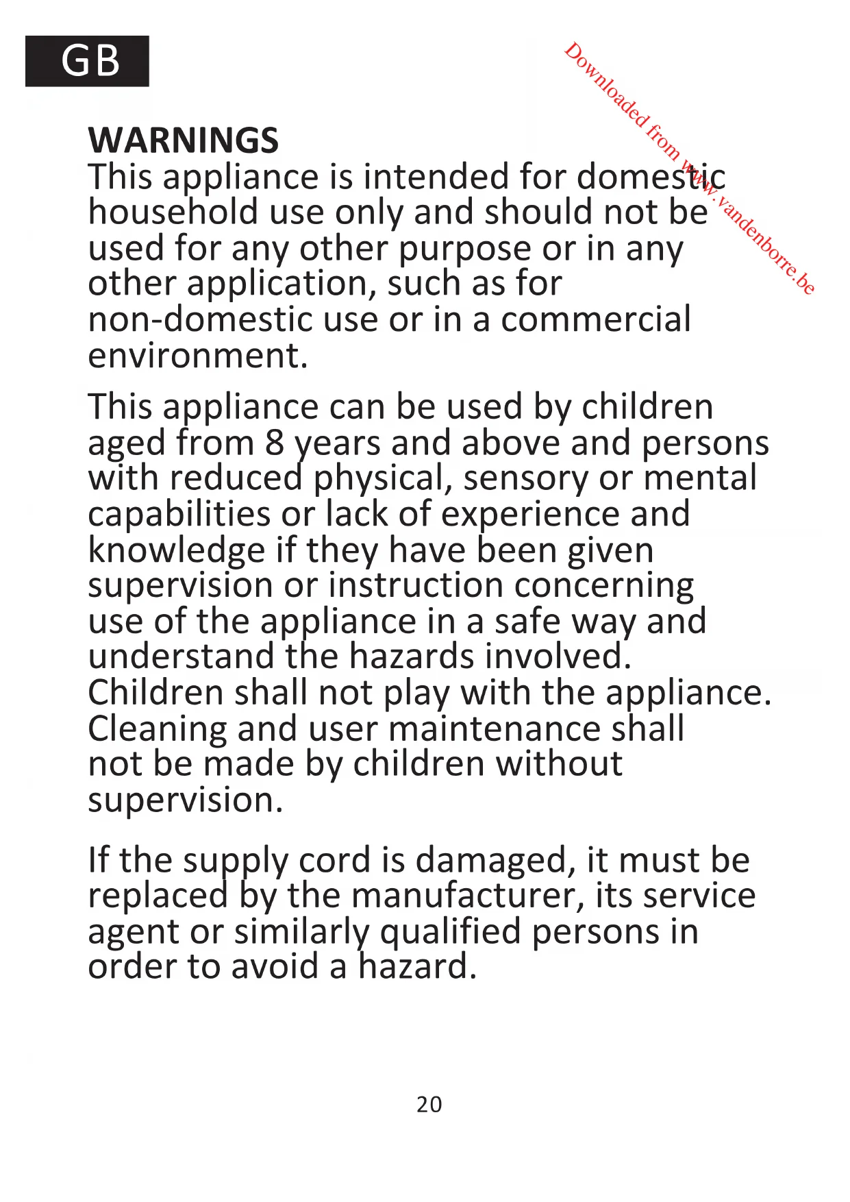WARNINGS This appliance is intended for domestic household use only and should not be used for any other purpose or in any other application, such as for non-domestic use or in a commercial environment. This appliance can be used by children aged from 8 years and above and persons with reduced physical, sensory or mental capabilities or lack of experience and knowledge if they have been given supervision or instruction concerning use of the appliance in a safe way and understand the hazards involved. Children shall not play with the appliance. Cleaning and user maintenance shall not be made by children without supervision. If the supply cord is damaged, it must be replaced by the manufacturer, its service agent or similarly qualified persons in order to avoid a hazard. Downloaded from www.vandenborre.beGB