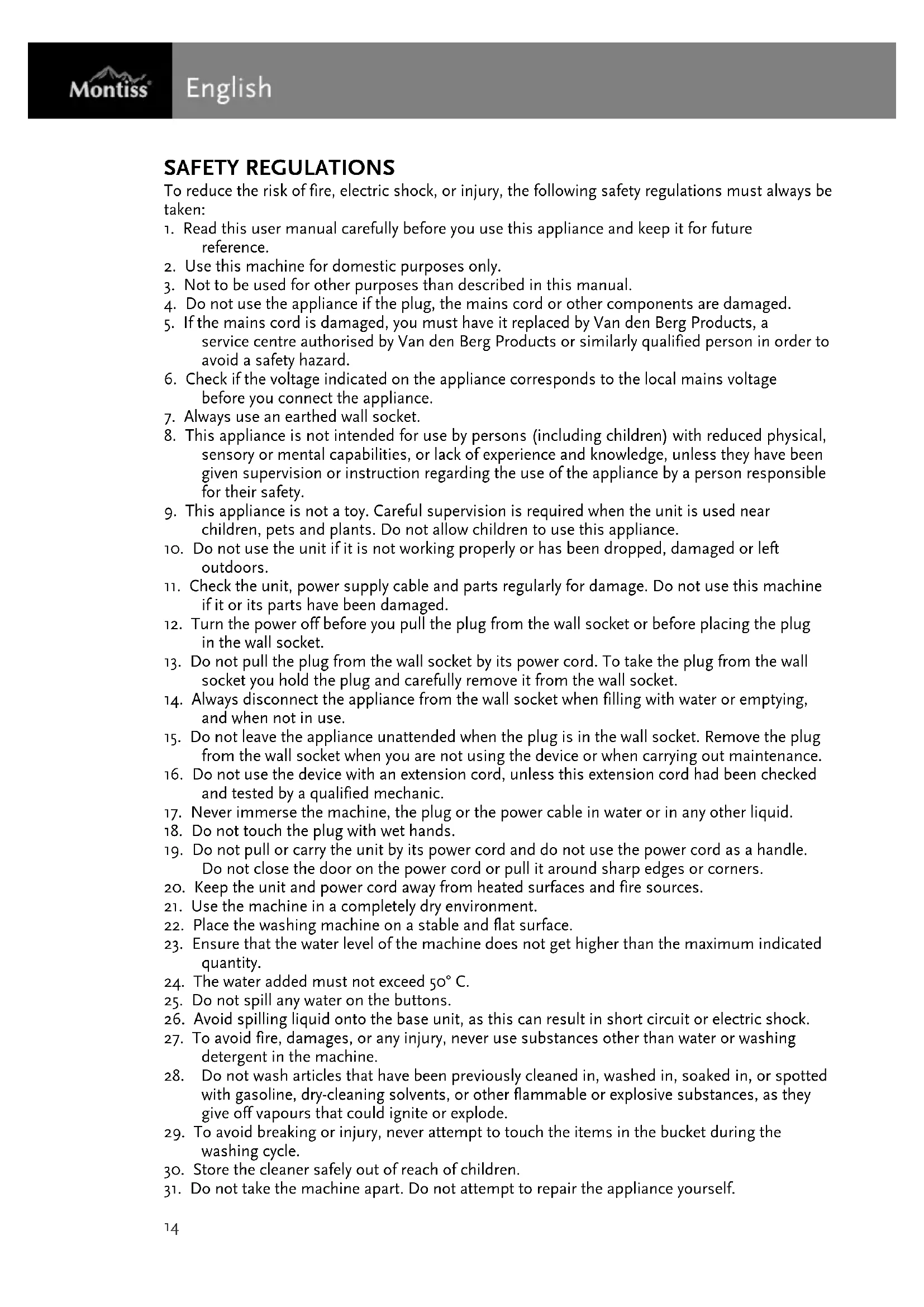 14. Always disconnect the appliance from the wall socket when filling with water or emptying,