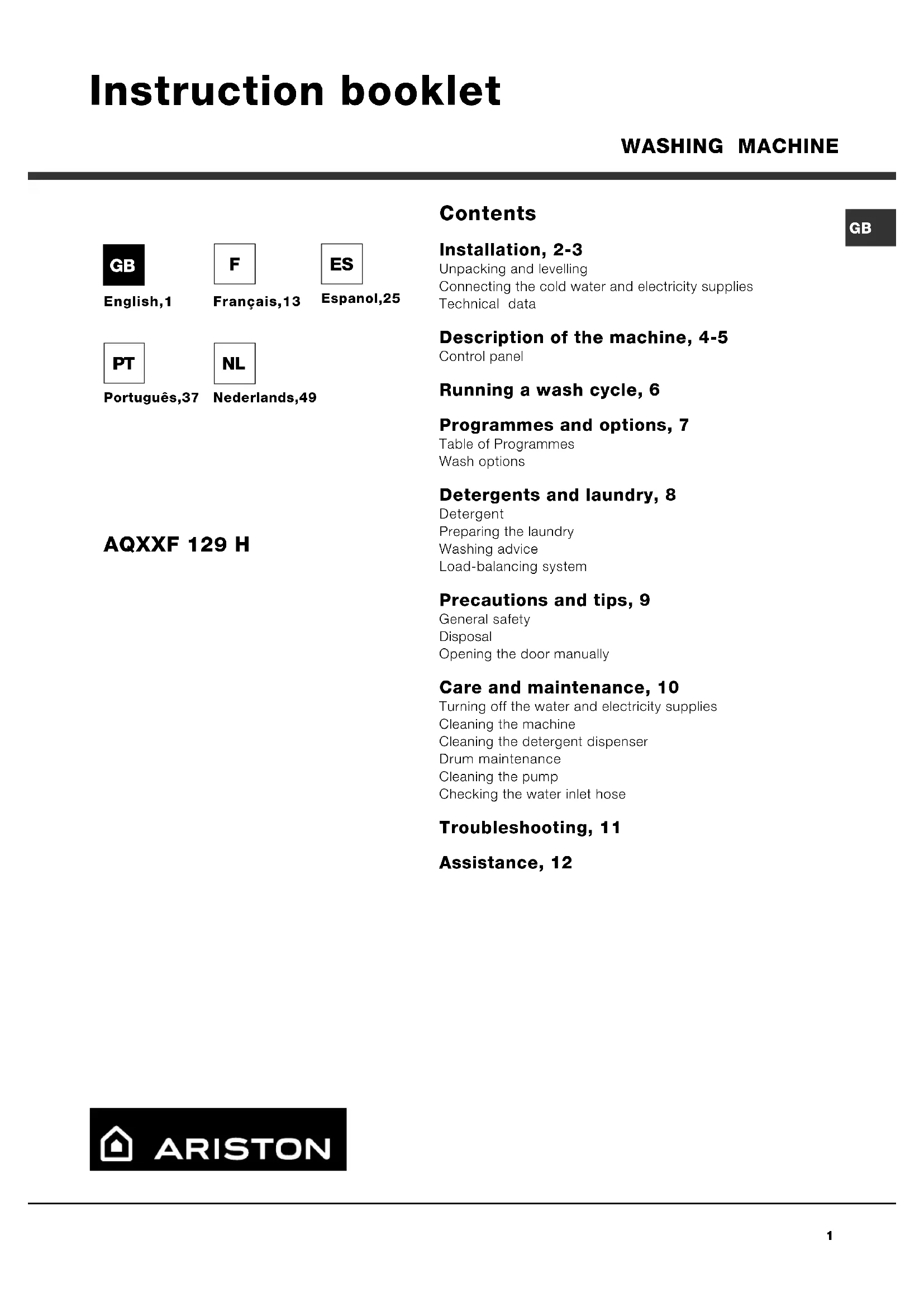 AQXXF 129 H Instruction booklet Contents Installation, 2-3 Unpacking and levelling Connecting the cold water and electricity supplies Technical data Description of the machine, 4-5 Control panel Running a wash cycle, 6 Programmes and options, 7 Table of Programmes Wash options Detergents and laundry, 8 Detergent Preparing the laundry Washing advice Load-balancing system Precautions and tips, 9 General safety Disposal Opening the door manually Care and maintenance, 10 Turning off the water and electricity supplies Cleaning the machine Cleaning the detergent dispenser Drum maintenance Cleaning the pump Checking the water inlet hose Troubleshooting, 11 Assistance, 12