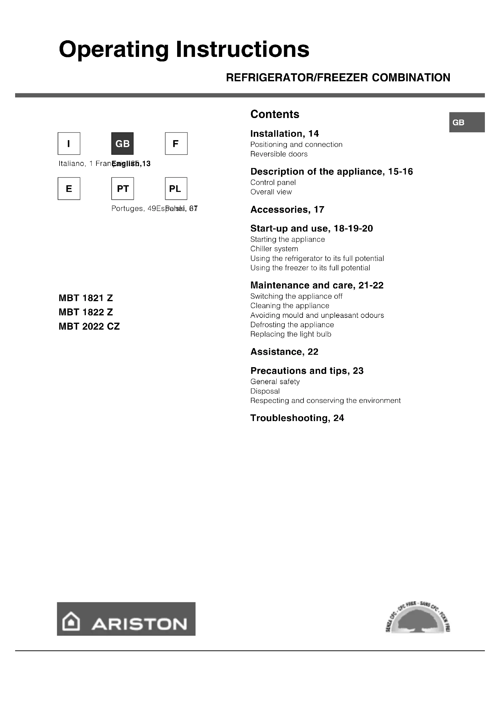 Contents Installation, 14 Positioning and connection Reversible doors Description of the appliance, 15-16 Control panel Overall view Accessories, 17 Start-up and use, 18-19-20 Starting the appliance Chiller system Using the refrigerator to its full potential Using the freezer to its full potential Maintenance and care, 21-22 Switching the appliance off Cleaning the appliance Avoiding mould and unpleasant odours Defrosting the appliance Replacing the light bulb Assistance, 22 Precautions and tips, 23 General safety Disposal Respecting and conserving the environment Troubleshooting, 24 Operating Instructions Italiano, 1 Français, 25 Portuges, 49Espanol, 37 English,13