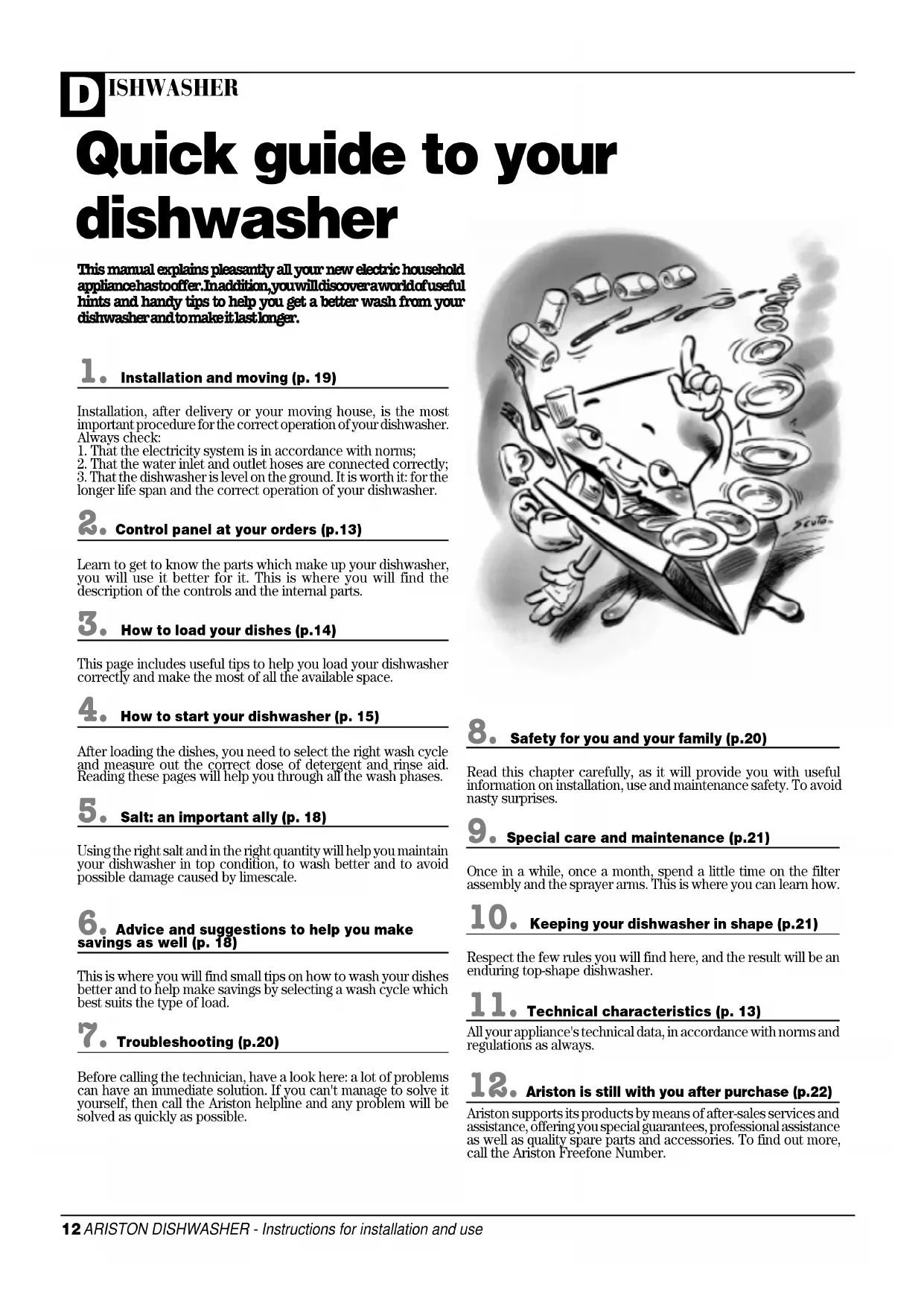 Ariston supports its products by means of after-sales services andassistance, offering you special guarantees, professional assistanceas well as quality spare parts and accessories. To find out more,call the Ariston Freefone Number.This manual explains pleasantly all your new electric householdappliance has to offer. In addition, you will discover a world of usefulhints and handy tips to help you get a better wash from yourdishwasher and to make it last longer.ARISTON DISHWASHER - Instructions for installation and use 13