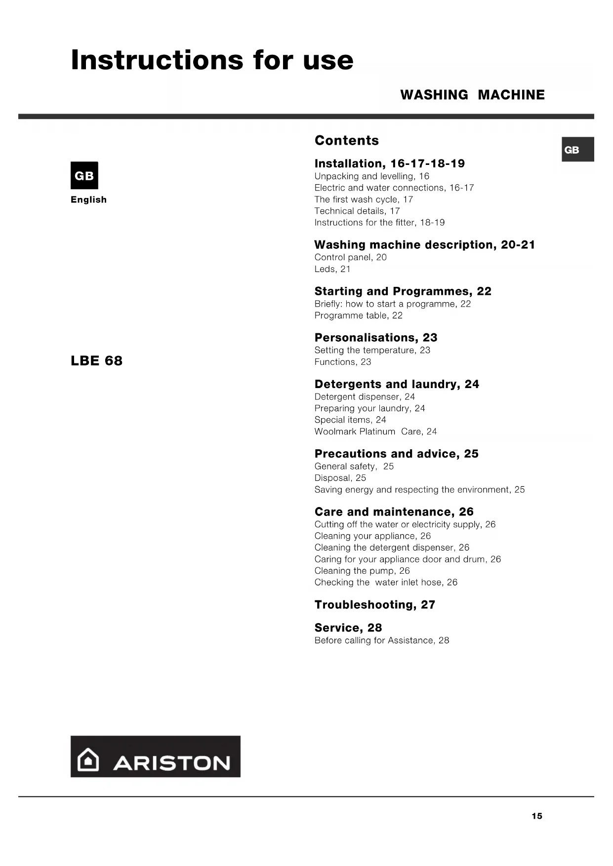 English Contents Installation, 16-17-18-19 Unpacking and levelling, 16 Electric and water connections, 16-17 The first wash cycle, 17 Technical details, 17 Instructions for the fitter, 18-19 Washing machine description, 20-21 Control panel, 20 Leds, 21 Starting and Programmes, 22 Briefly: how to start a programme, 22 Programme table, 22 Personalisations, 23 Setting the temperature, 23 Functions, 23 Detergents and laundry, 24 Detergent dispenser, 24 Preparing your laundry, 24 Special items, 24 Woolmark Platinum Care, 24 Precautions and advice, 25 General safety, 25 Disposal, 25 Saving energy and respecting the environment, 25 Care and maintenance, 26 Cutting off the water or electricity supply, 26 Cleaning your appliance, 26 Cleaning the detergent dispenser, 26 Caring for your appliance door and drum, 26 Cleaning the pump, 26 Checking the water inlet hose, 26 Troubleshooting, 27 Service, 28 Before calling for Assistance, 28 WASHING MACHINE LBE 68 Instructions for use GB16
