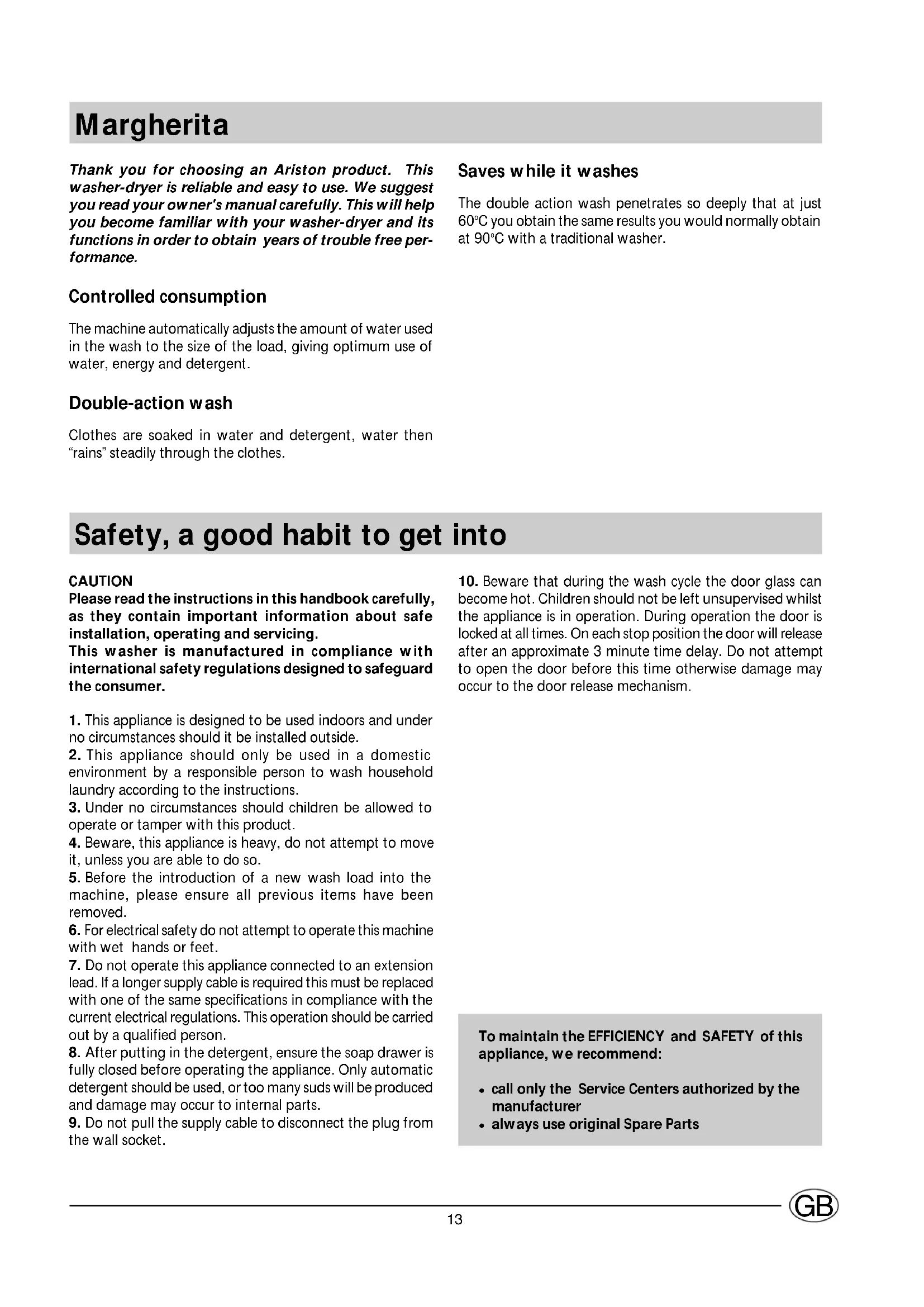 Thank you for choosing an Ariston product. This washer-dryer is reliable and easy to use. We suggest you read your owner's manual carefully. This will help you become familiar with your washer-dryer and its functions in order to obtain years of trouble free per- formance. Controlled consumption The machine automatically adjusts the amount of water used in the wash to the size of the load, giving optimum use of water, energy and detergent. Double-action wash Clothes are soaked in water and detergent, water then “rains” steadily through the clothes. Safety, a good habit to get into CAUTION Please read the instructions in this handbook carefully, as they contain important information about safe installation, operating and servicing. This washer is manufactured in compliance with international safety regulations designed to safeguard the consumer.