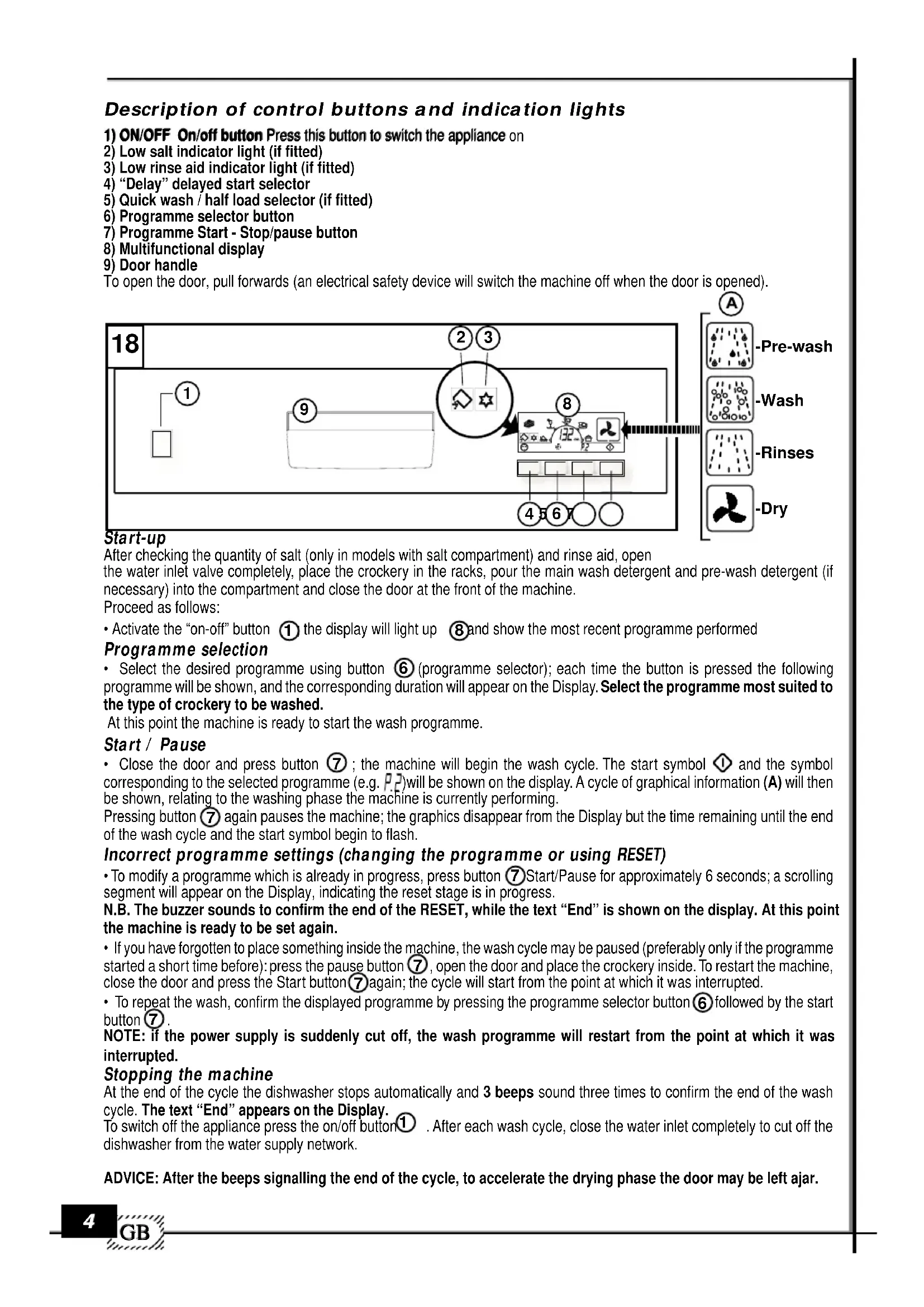- To repeat the wash, confirm the displayed programme by pressing the programme selector button and close the door. NOTE: if the power supply is suddenly cut off, the wash programme will restart from the point at which it wasinterrupted. Stopping the machine At the end of the cycle the dishwasher stops automatically and 3 beeps sound three times to confirm the end of the wash cycle. The text “End” appears on the Display; when the door is opened the Display lights up and the text is shown for a further 10 seconds, after which the number of the most recent programme performed remains visible. To switch off the machine, press the on/off button . After each wash cycle, close the water inlet completely to cut off the dishwasher from the water supply network.ADVICE: After the beeps signalling the end of the cycle, to accelerate the drying phase the door may be left ajar. 18a