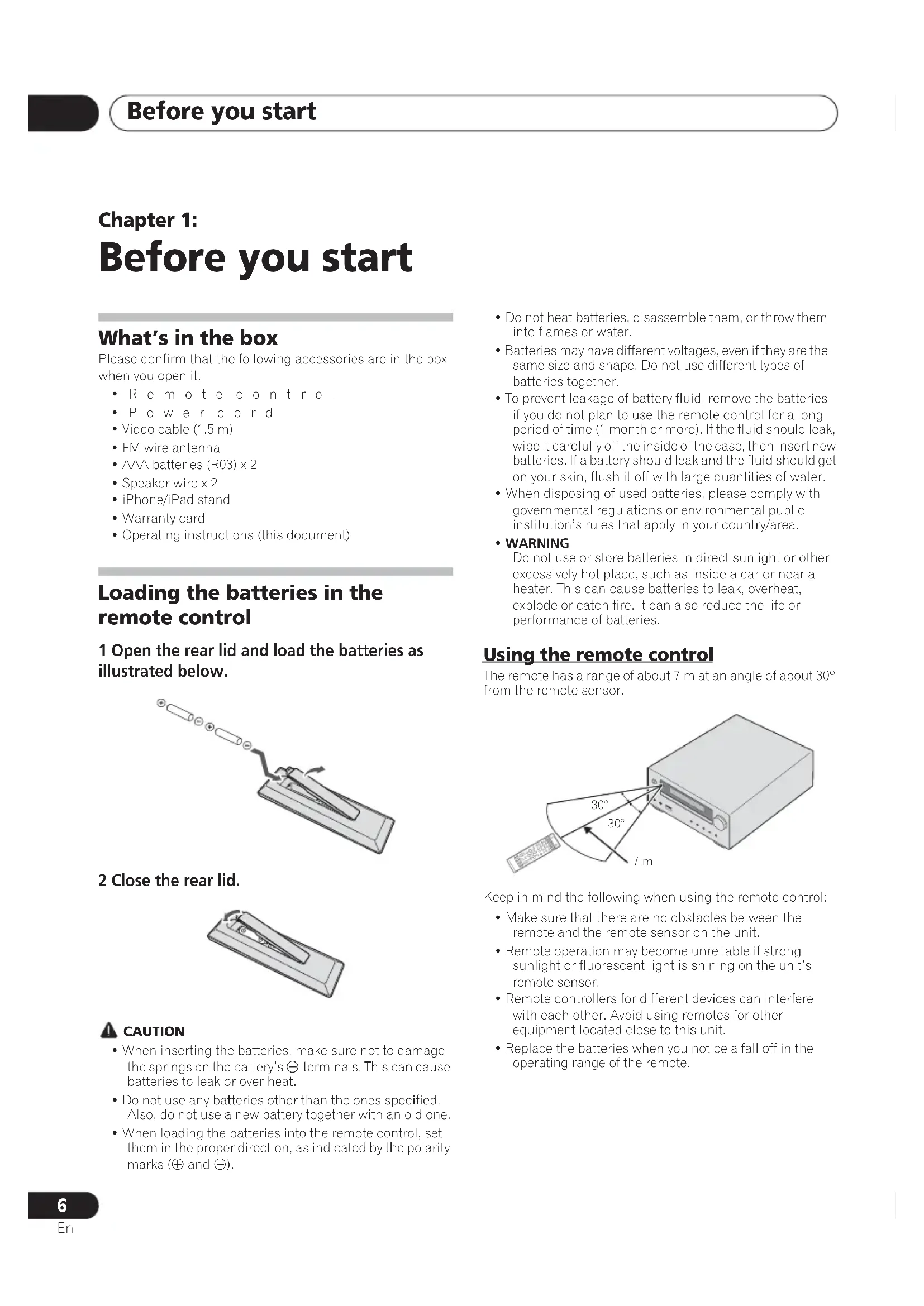 Before you start What’s in the box Please confirm that the following accessories are in the box when you open it.•Remote control•Power cord• Video cable (1.5 m)• FM wire antenna• AAA batteries (R03) x 2• Speaker wire x 2• iPhone/iPad stand• Warranty card• Operating instructions (this document) Loading the batteries in the remote control 1 Open the rear lid and load the batteries as illustrated below. 2 Close the rear lid. CAUTION• When inserting the batteries, make sure not to damage the springs on the battery’s terminals. This can cause batteries to leak or over heat.• Do not use any batteries other than the ones specified. Also, do not use a new battery together with an old one.• When loading the batteries into the remote control, set them in the proper direction, as indicated by the polarity marks ( and ).