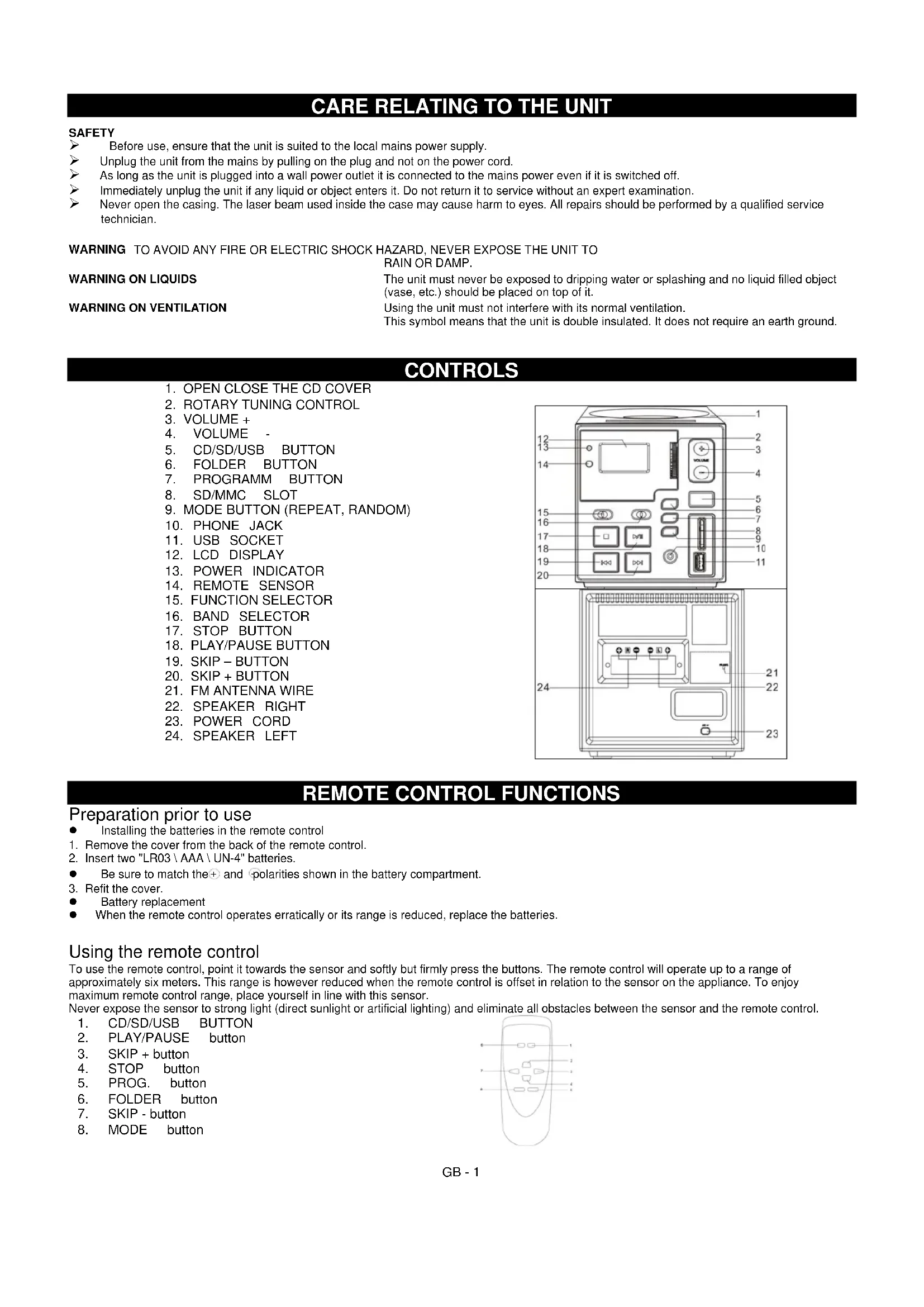 Select the CD/MP3/USB Mode function. The display shows the total number of tracks. Press the Play button to start playing the first track. To suspend play, press the PLAY/PAUSE button then press this button again to return to the normal play mode. To select the Folder, use the remote control. Press the Folder |<< and >>| buttons to select the next or previous folder. To stop playing the CD, press the STOP button.GB - 3 PROGRAMMING TRACKS You can program up to 20 tracks in any order. Select the CD/MP3/USB Mode function. Press the PROG button. Press the SKIP Up/Down button or the FOLDER |<< / >>| buttons to select the track or folder number that you wish to add to your programming. Once you have selected the track of your choice, press the PROG button. Repeat steps 2 to 4 to add more tracks. Once all of the tracks you wish to hear have been programmed, press the PLAY/PAUSE button to start playing the programmed selection. Play starts from the beginning of the first track programmed. The programming stored in memory is cleared when you select the Radio function or when you switch off the unit. MODE BUTTON (IN USB AND MP3 MODES) To repeat one or all tracks, press the MODE button before or during play. Press the MODE button once to repeat only the track currently being played, press this same button twice to repeat the entire CD and three times to select the Random mode. Press this button once again to return to the normal mode.