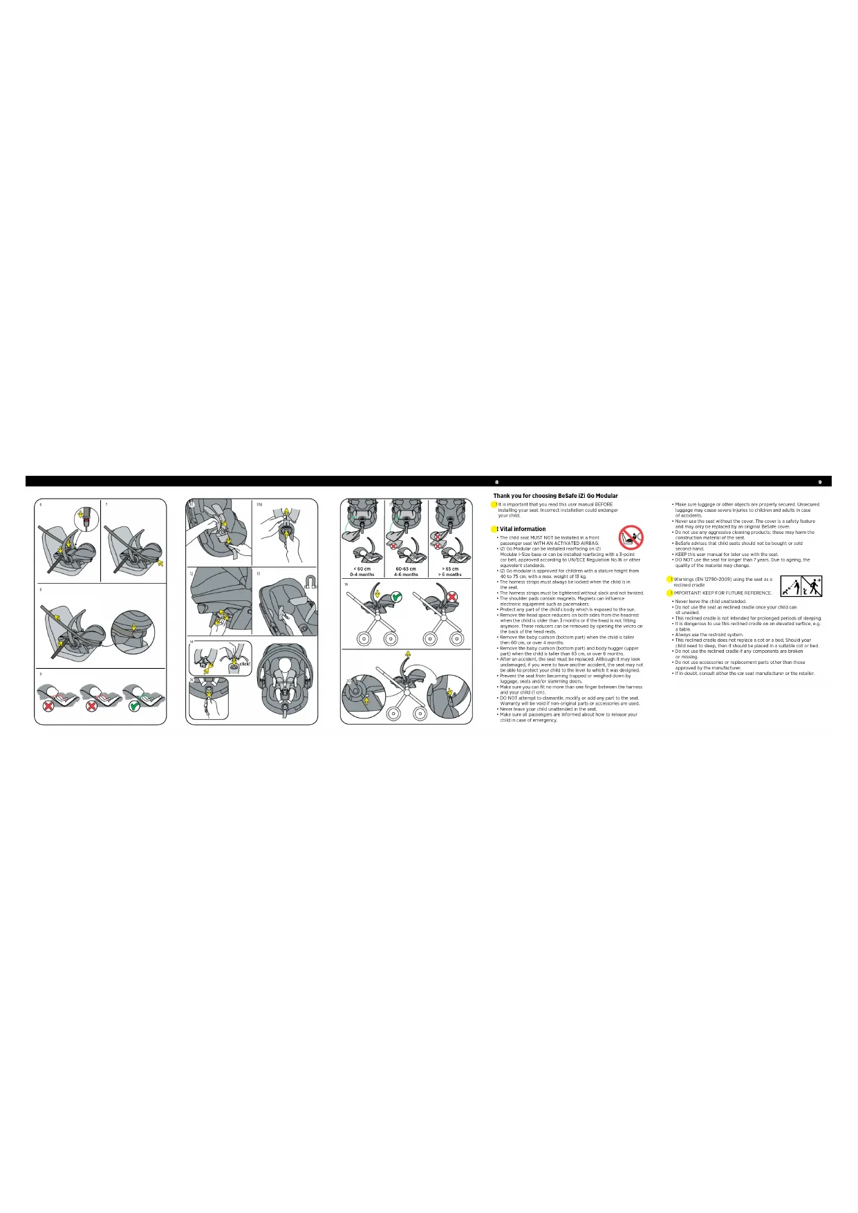 click! < 60 cm 0-4 months 60-65 cm 4-6 months > 65 cm > 6 months > 25 cm Thank you for choosing BeSafe iZi Go Modular ! It is important that you read this user manual BEFORE installing your seat. Incorrect installation could endanger your child. ! Warnings (EN 12790-2009) using the seat as a reclined cradle ! IMPORTANT! KEEP FOR FUTURE REFERENCE.