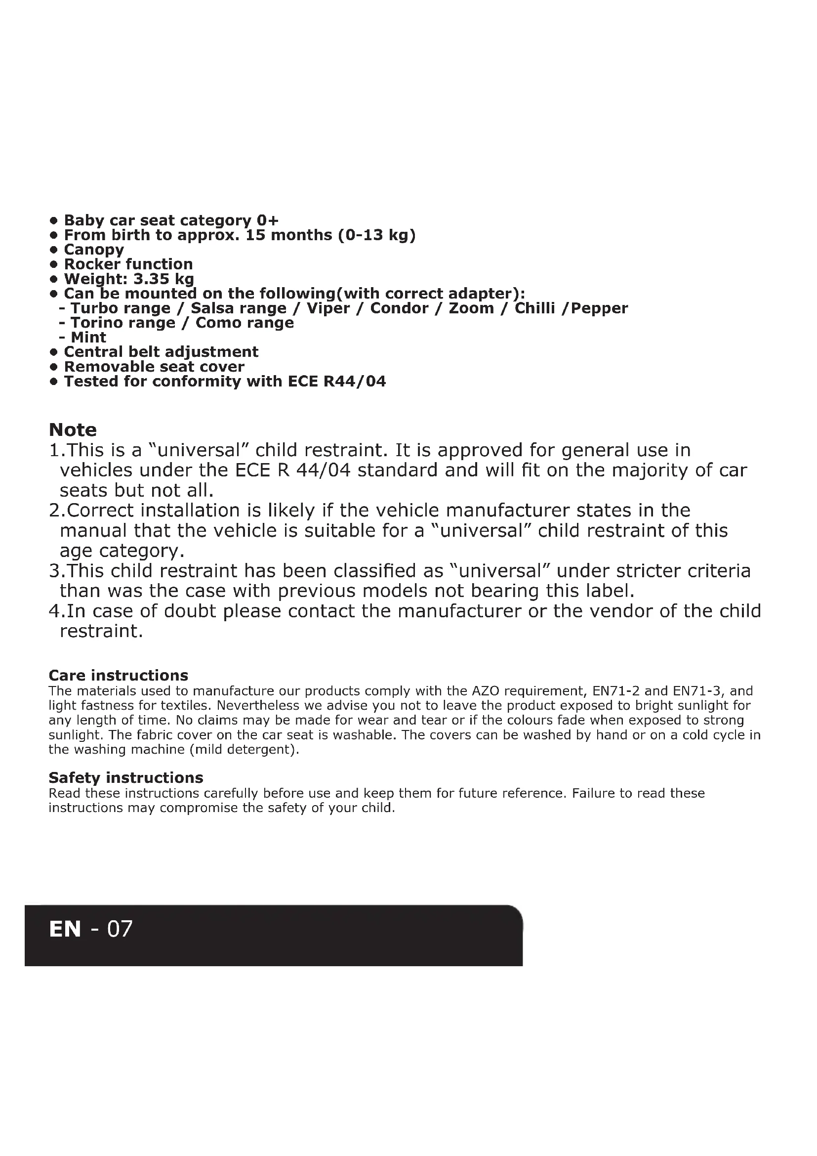 - Tested for conformity with ECE R44/04 Note 1.This is a “universal” child restraint. It is approved for general use in vehicles under the ECE R 44/04 standard and will t on the majority of car seats but not all. 2.Correct installation is likely if the vehicle manufacturer states in the manual that the vehicle is suitable for a “universal” child restraint of this age category. 3.This child restraint has been classied as “universal” under stricter criteria than was the case with previous models not bearing this label. 4.In case of doubt please contact the manufacturer or the vendor of the child restraint. Care instructions The materials used to manufacture our products comply with the AZO requirement, EN71-2 and EN71-3, and light fastness for textiles. Nevertheless we advise you not to leave the product exposed to bright sunlight for any length of time. No claims may be made for wear and tear or if the colours fade when exposed to strong sunlight. The fabric cover on the car seat is washable. The covers can be washed by hand or on a cold cycle in the washing machine (mild detergent). Safety instructions Read these instructions carefully before use and keep them for future reference. Failure to read these instructions may compromise the safety of your child.EN - 08 NB: