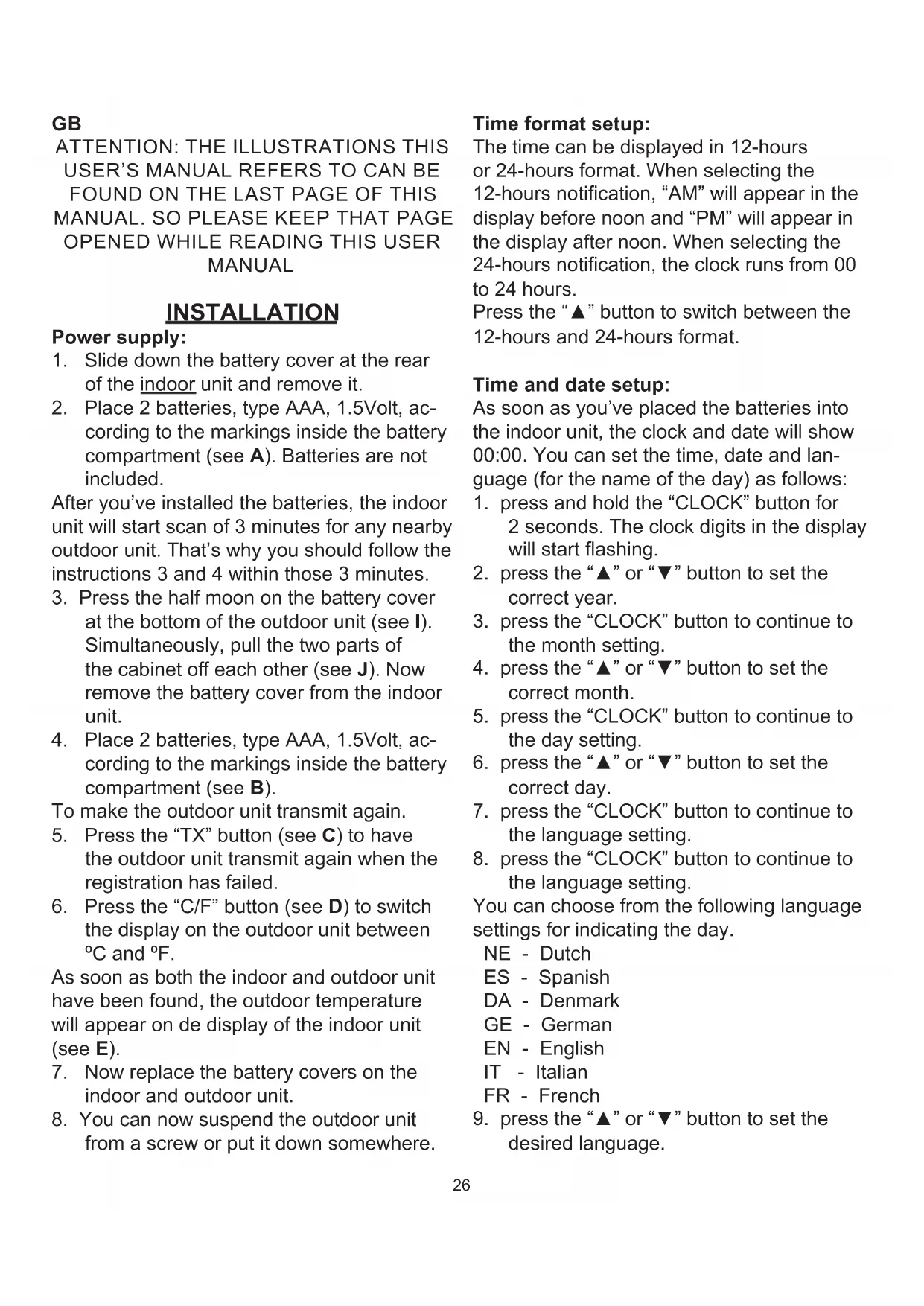 from a screw or put it down somewhere. Time format setup: The time can be displayed in 12-hours or 24-hours format. When selecting the 12-hours notication, “AM” will appear in the display before noon and “PM” will appear in the display after noon. When selecting the 24-hours notication, the clock runs from 00 to 24 hours. Press the “▲” button to switch between the 12-hours and 24-hours format. Time and date setup: As soon as you’ve placed the batteries into the indoor unit, the clock and date will show 00:00. You can set the time, date and lan- guage (for the name of the day) as follows: