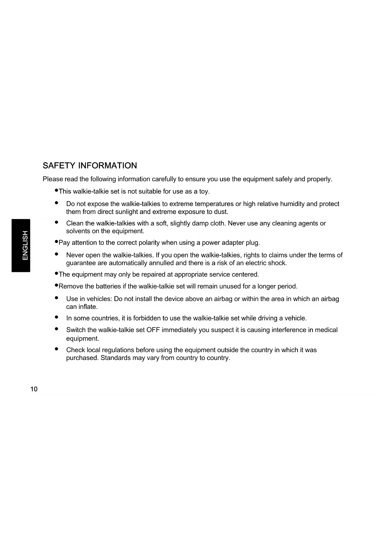ENGLISH SAFETY INFORMATION Please read the following information carefully to ensure you use the equipment safely and properly. S This walkie−talkie set is not suitable for use as a toy. S Do not expose the walkie−talkies to extreme temperatures or high relative humidity and protect them from direct sunlight and extreme exposure to dust. S Clean the walkie−talkies with a soft, slightly damp cloth. Never use any cleaning agents or solvents on the equipment. S Pay attention to the correct polarity when using a power adapter plug. S Never open the walkie−talkies. If you open the walkie−talkies, rights to claims under the terms of guarantee are automatically annulled and there is a risk of an electric shock. S The equipment may only be repaired at appropriate service centered. S Remove the batteries if the walkie−talkie set will remain unused for a longer period. S Use in vehicles: Do not install the device above an airbag or within the area in which an airbag can inflate. S In some countries, it is forbidden to use the walkie−talkie set while driving a vehicle. S Switch the walkie−talkie set OFF immediately you suspect it is causing interference in medical equipment. S Check local regulations before using the equipment outside the country in which it was purchased. Standards may vary from country to country.DEUTSCH ENGLISH