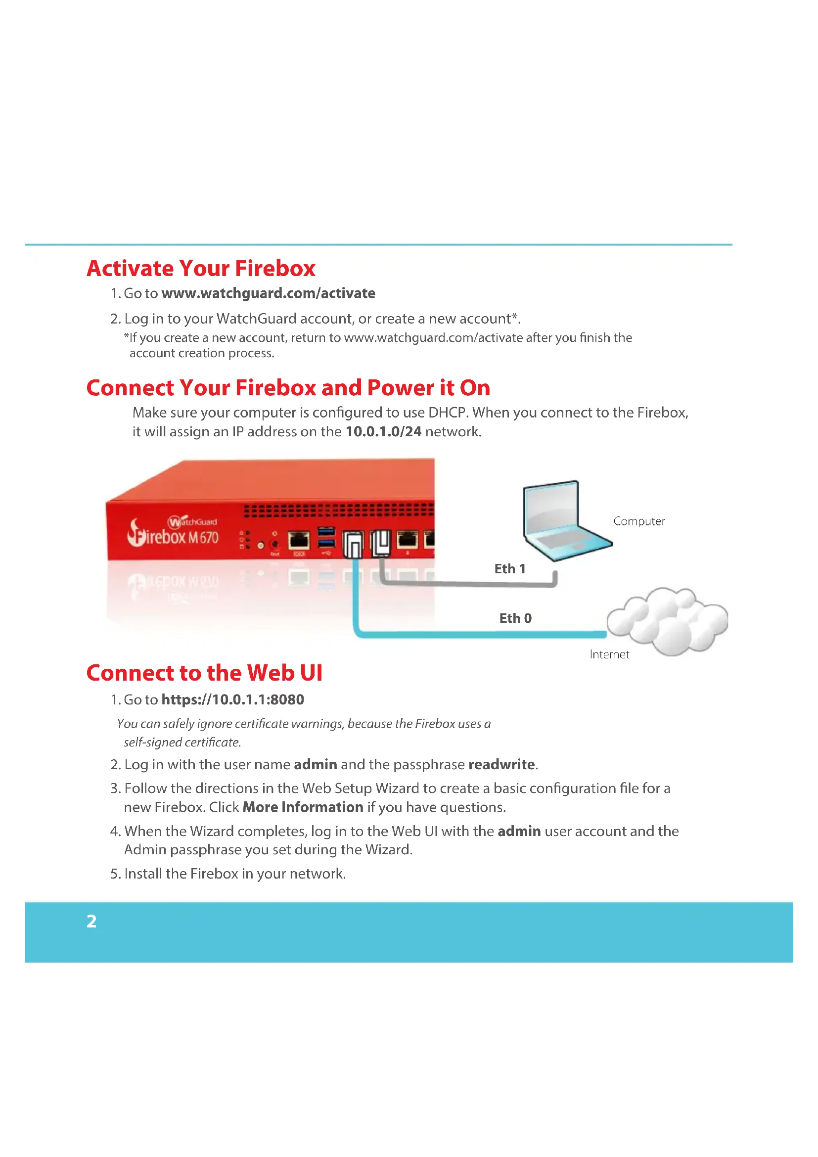 Eth 1 Eth 0 English ComputerInternet3 After you run the Web Setup Wizard your Firebox has a basic conguration:• Allows outbound FTP, Ping, DNS, TCP, and UDP connections• Blocks all unrequested trac from the external network• Inspects outgoing FTP, HTTP, and HTTPS trac• Uses licensed security services to protect the trusted and optional networks Next Steps Congratulations! You have nished basic setup of your Firebox. You can use the Web UI to view and edit your conguration and to manage and monitor your Firebox. Or, you can download and install WatchGuard System Manager (WSM) and use Policy Manager and the WSM suite of management and monitoring tools. Here are some recommendations to help you get started: Verify your Internet connectivity