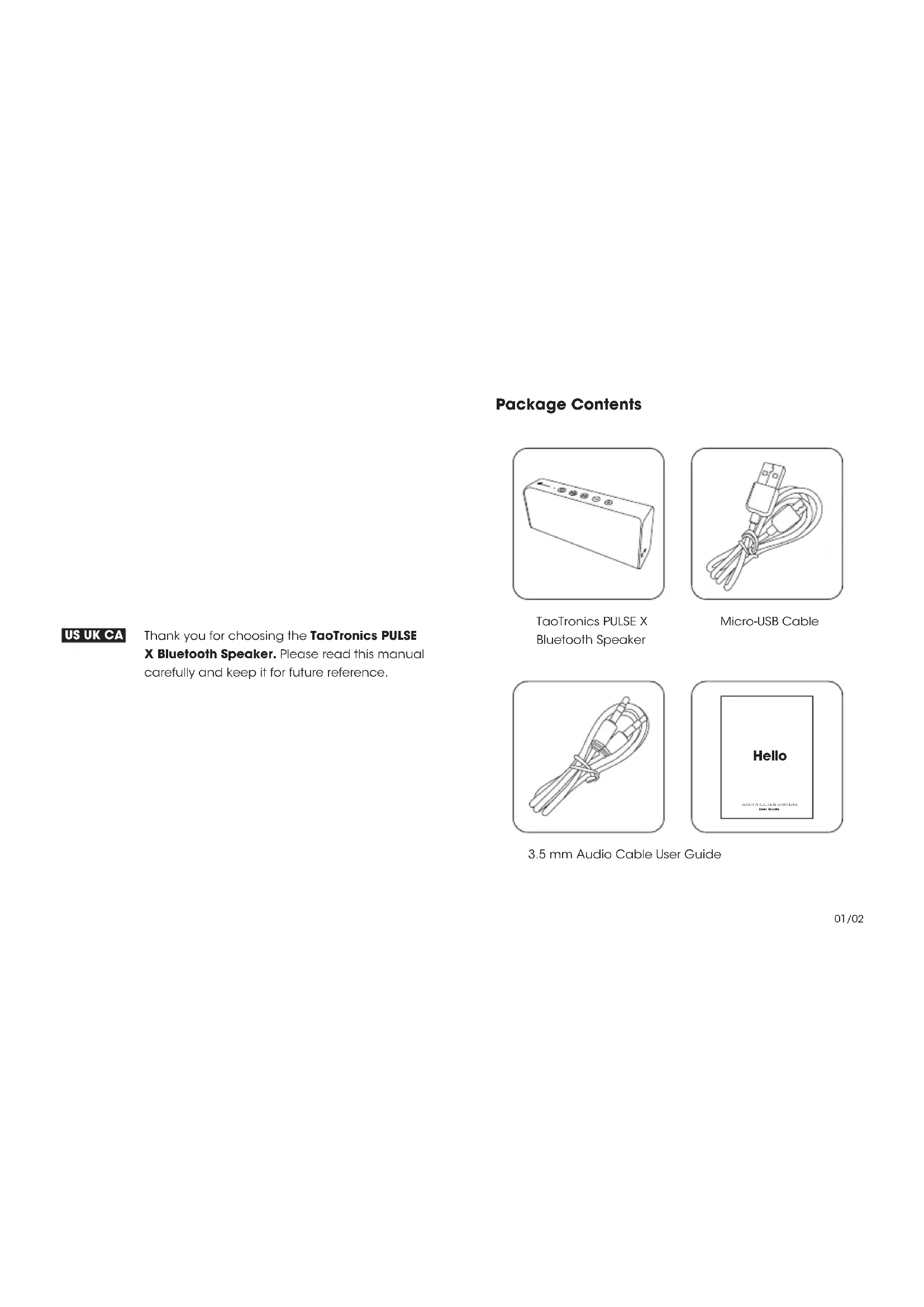 01/10 11/21 22/30 31/43 44/54 55/62Thank you for choosing the TaoTronics PULSE X Bluetooth Speaker. Please read this manual carefully and keep it for future reference. US UK CA Package Contents TaoTronics PULSE X Bluetooth Speaker Micro-USB Cable