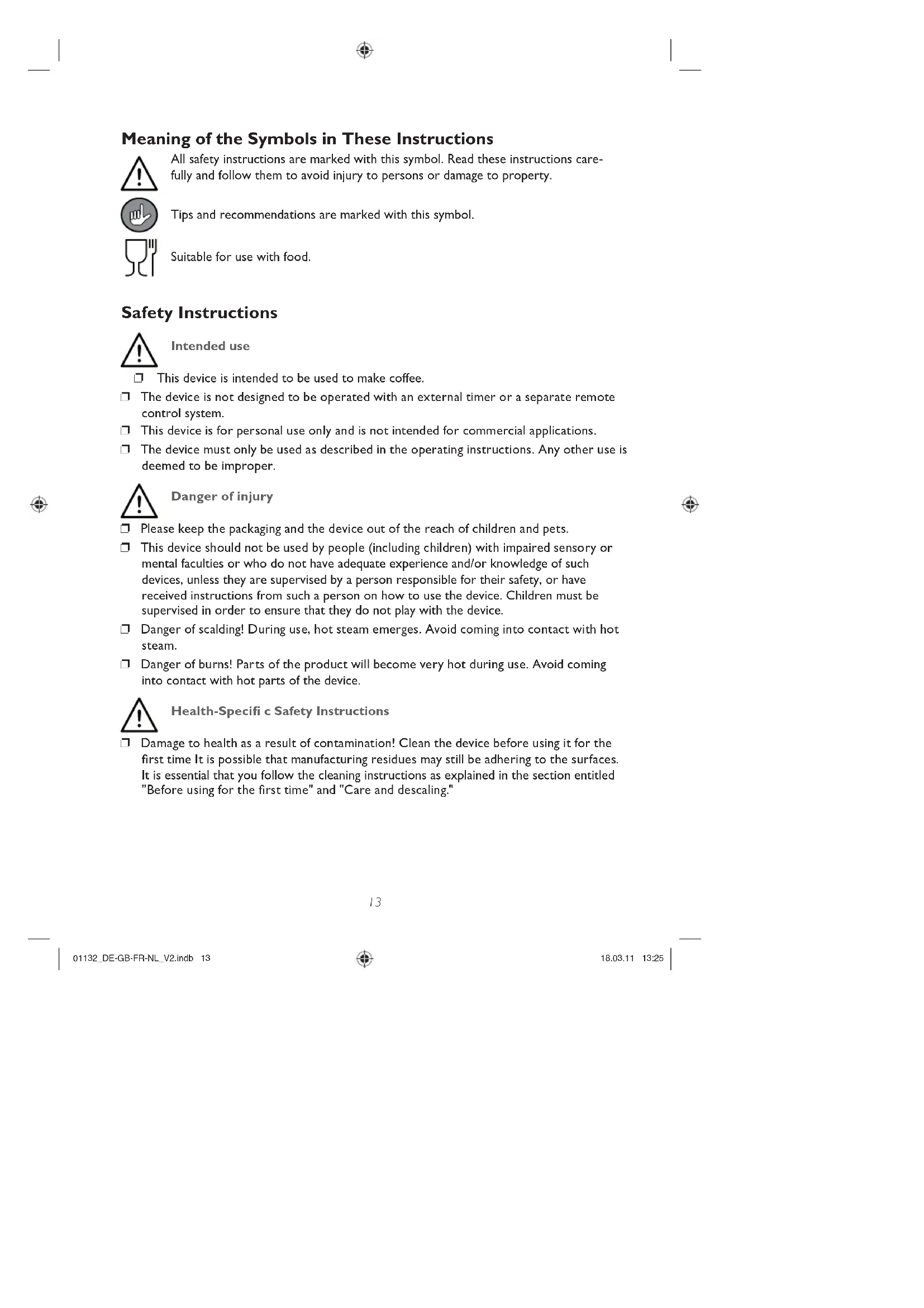 water (no coffee) to fl ush through all the lines etc. Before fi rst using the device, please also note the information in the "Use" section. Use PLEASE NOTE! ❐ Do not overfi ll the water reservoir. Never pour water into the water reservoir above the MAX marking. ❐ Never operate the device without water. ❐ RISK OF SCALDING! Never open the fi lter compartment during the brewing procedure. Hot steam may emerge. ❐ The device has overheating protection which prevents the device from being switched on again directly after a brewing procedure for safety reasons. After a brewing procedure, you should therefore wait for a few minutes until the device has cooled down before you start another brewing procedure. ❐ The coffee machine has a non-drip valve which only works in combination with the thermal cups which are supplied with the product. Do not attempt to place other vessels beneath the coffee discharge opening. 01132_DE-GB-FR-NL_V2.indb 1701132_DE-GB-FR-NL_V2.indb 17 18.03.11 13:2518.03.11 13:2518 Commissioning and making basic settings