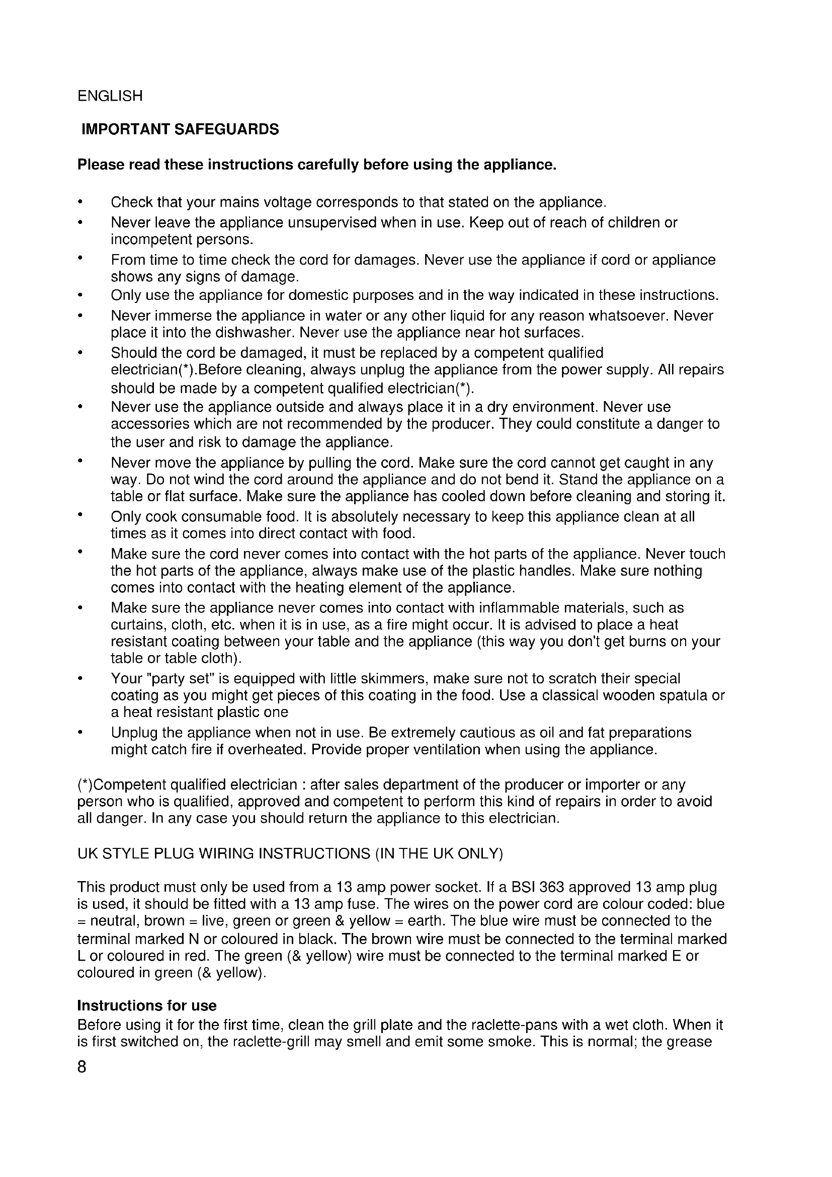 Unplug the appliance when not in use. Be extremely cautious as oil and fat preparations might catch fire if overheated. Provide proper ventilation when using the appliance. (*)Competent qualified electrician : after sales department of the producer or importer or any person who is qualified, approved and competent to perform this kind of repairs in order to avoid all danger. In any case you should return the appliance to this electrician. UK STYLE PLUG WIRING INSTRUCTIONS (IN THE UK ONLY) This product must only be used from a 13 amp power socket. If a BSI 363 approved 13 amp plug is used, it should be fitted with a 13 amp fuse. The wires on the power cord are colour coded: blue = neutral, brown = live, green or green & yellow = earth. The blue wire must be connected to the terminal marked N or coloured in black. The brown wire must be connected to the terminal marked L or coloured in red. The green (& yellow) wire must be connected to the terminal marked E or coloured in green (& yellow). Instructions for use Before using it for the first time, clean the grill plate and the raclette-pans with a wet cloth. When it is first switched on, the raclette-grill may smell and emit some smoke. This is normal; the grease9 that may have adhered to the element during manufacture is burning off We therefore recommend that you heat up the raclette-grill for about 10 minutes without any food (ventilate the room during this period). Always pre-heat your appliance on the highest level during more or less 10 minutes before using it. In order to prevent grease stains on your table cloth, don't forget to put another, easy-washing cloth under your appliance. Grill Put the raclette-grill in the middle of the table. Cut the meat into small pieces. You thus reduce the cooking time. Chop the crude meat and serve it on a plate or a wooden board. Your guests can then choose the quantity of meat they wish and grill it on the grill plate. You can grill toasts in the raclette pans, cook fruit through or over, fry eggs or potatoes and many other things. You may serve the grilled meat with different sauces, salad or French baguette. Raclette Raclette is a typical Swiss dish. You can obtain a good raclette by using the original raclette cheese. Take about 150-250 grams for each person. Cut the cheese into slices (more or less 2 mm thick). Prepare potatoes in their skin, which you will put into a covered bowl or on the grill, in order to keep them warm. Put the raclette-grill in the middle of the table. Put the cheese into the raclette pans and place them under the heating tube. The cheese will melt after 3 or 4 minutes. As soon as the cheese has melted and taken a brownish-golden colour, you can serve it as it is on the plates or spread it out on the potatoes in their skin. Add some fresh ground black pepper. Raclette is served with raw ham or "Bindner" meat, little onions and pickles, as well as a dry wine. Cleaning Before cleaning, unplug and wait for the appliance to cool down. Wipe the inside and the edges of the appliance with a paper towel or a soft cloth. Wipe the outside with only a slightly moistened cloth ensuring that no moisture, oil or grease enters the cooling slots. Do not clean the inside or outside with any abrasive scouring pad or steel wool as this will damage the finish. Do not immerse in water or any other liquid. Guidelines for protection of the environment