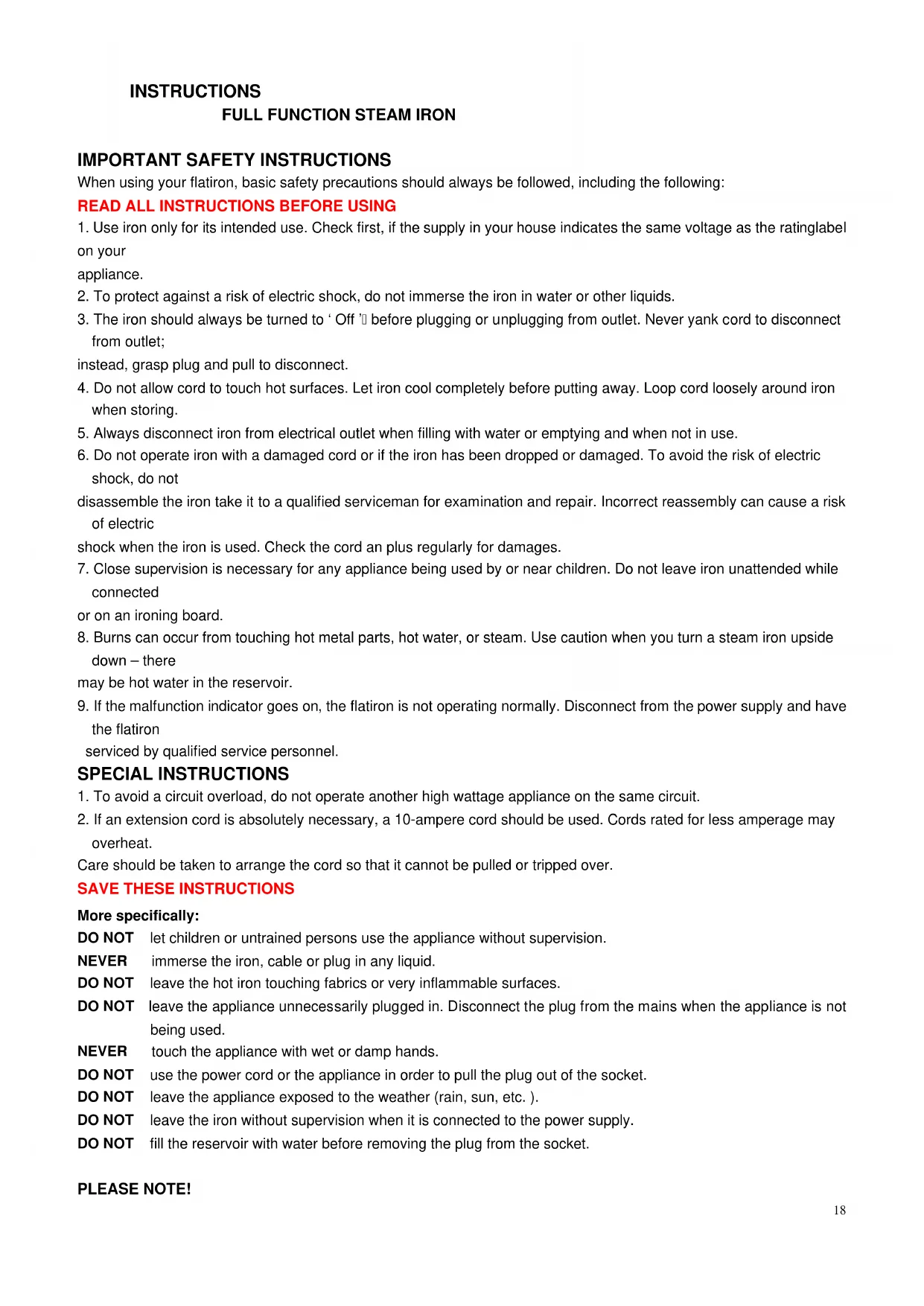 down – there may be hot water in the reservoir. 9. If the malfunction indicator goes on, the flatiron is not operating normally. Disconnect from the power supply and have the flatiron serviced by qualified service personnel. SPECIAL INSTRUCTIONS
