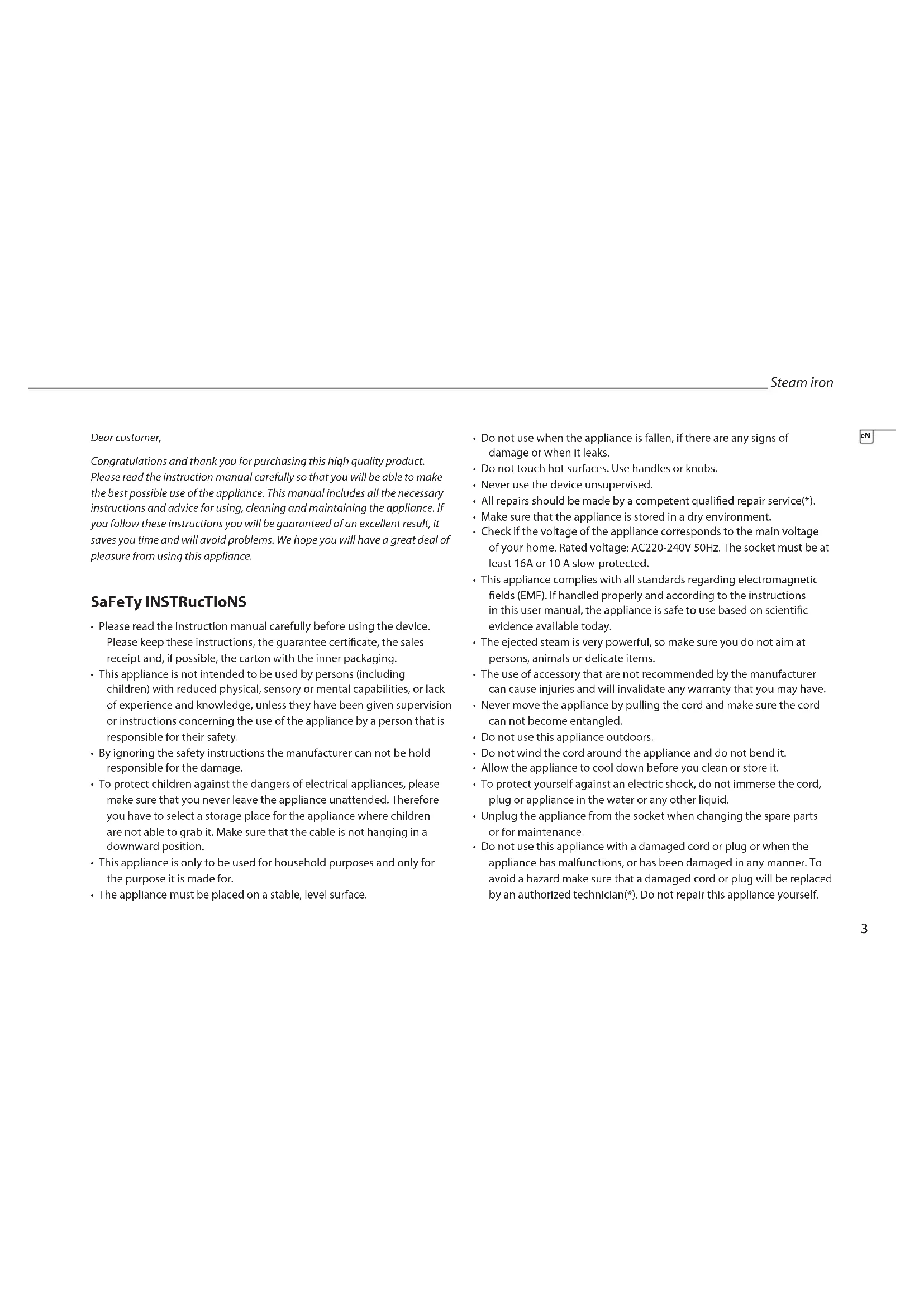 Instruction manual Gebruiksaanwijzing Mode d'emploi Bedienungsanleitung Manual de usuario Manual de utilizador Instrukcja obsługi Manuale utente Användare23 Steam iron Dear customer, Congratulations and thank you for purchasing this high quality product. Please read the instruction manual carefully so that you will be able to make the best possible use of the appliance. This manual includes all the necessary instructions and advice for using, cleaning and maintaining the appliance. If you follow these instructions you will be guaranteed of an excellent result, it saves you time and will avoid problems. We hope you will have a great deal of pleasure from using this appliance. SaFeTy INSTRucTIoNS