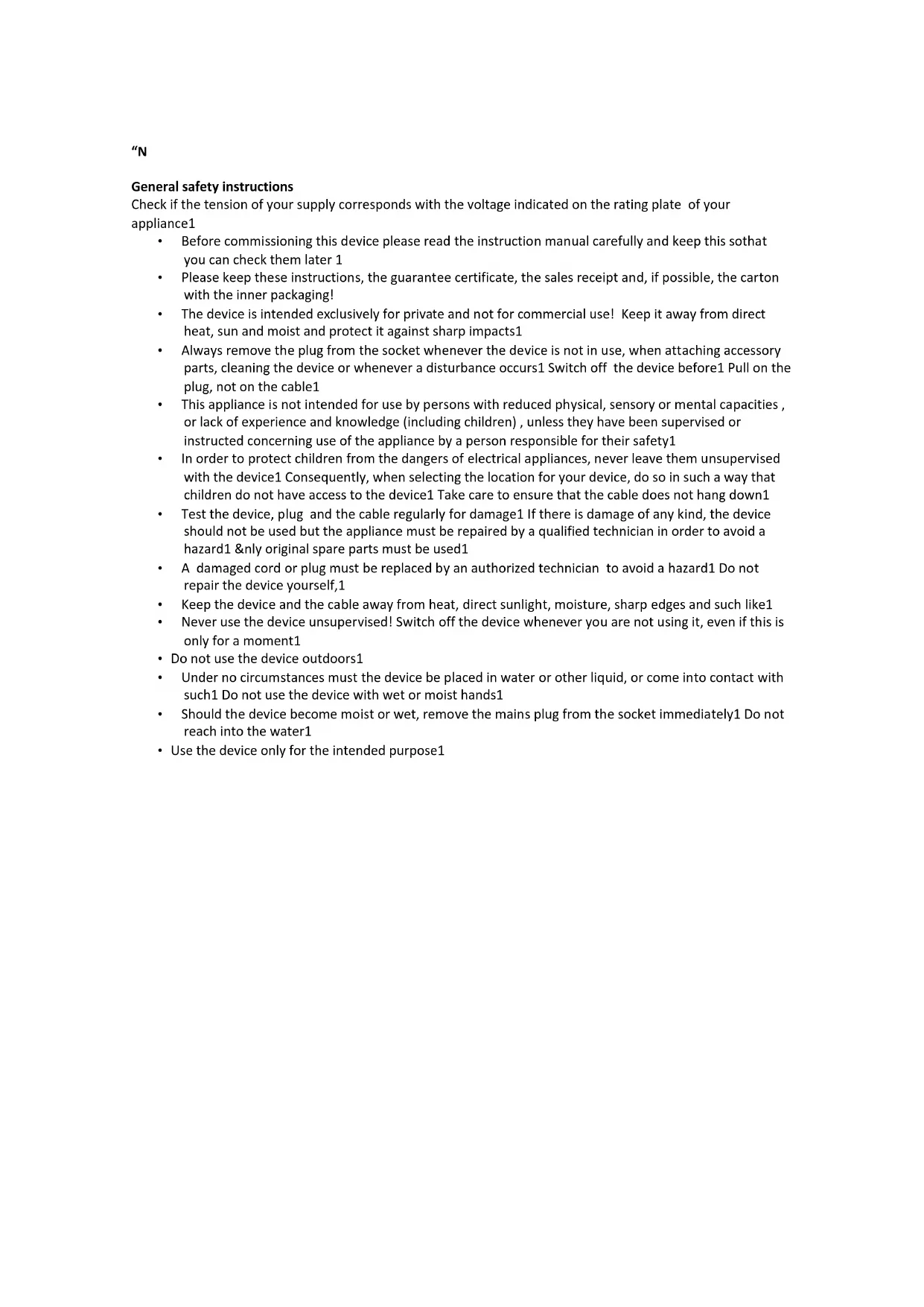 - Test the device, plug and the cable regularly for damage. If there is damage of any kind, the device should not be used but the appliance must be repaired by a qualified technician in order to avoid a hazard. Only original spare parts must be used.