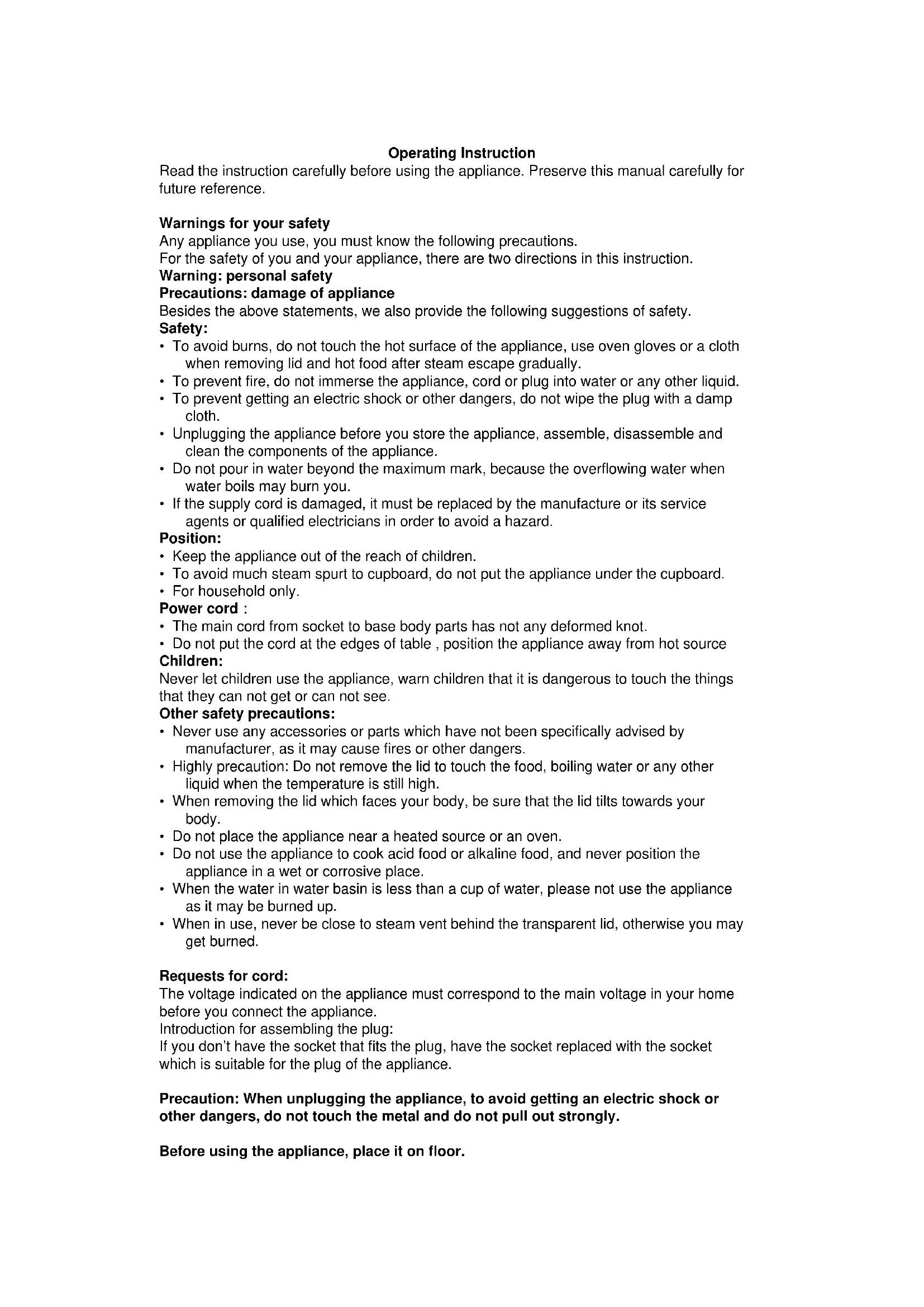 - Do not put the cord at the edges of table , position the appliance away from hot source Children: Never let children use the appliance, warn children that it is dangerous to touch the things that they can not get or can not see. Other safety precautions: