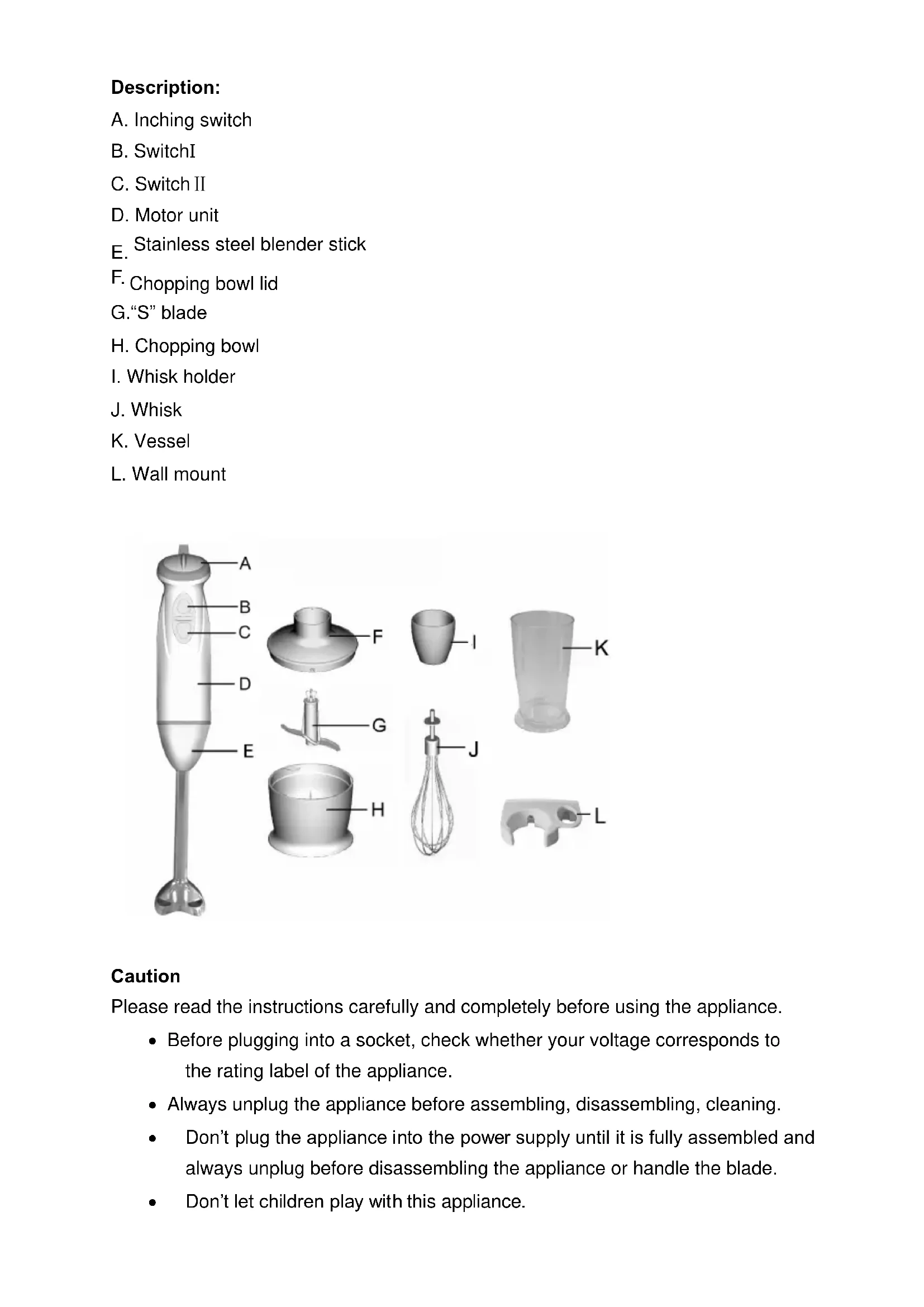 J. Whisk K. Vessel L. Wall mount Don’t let the motor unit, cord, or plug get wet. Never use a damaged appliance. If it has been damaged, please get it to approved service center, checked or repaired. If the supply cord is damaged, it must be replace by approved service center. Don’t let excess cord hang over the edge of the table or worktop or touch hot surface. The blades are very sharp! Don’t place the appliance in the hot ingredients. The appliance is constructed to process normal household quantities. Neither the measuring beaker, nor the chopping bowl is microwave proof. Short-time operating. Use the appliance for no longer than 1 minute, and don’t operate hard food for no longer than 15 seconds. How to use the hand blender