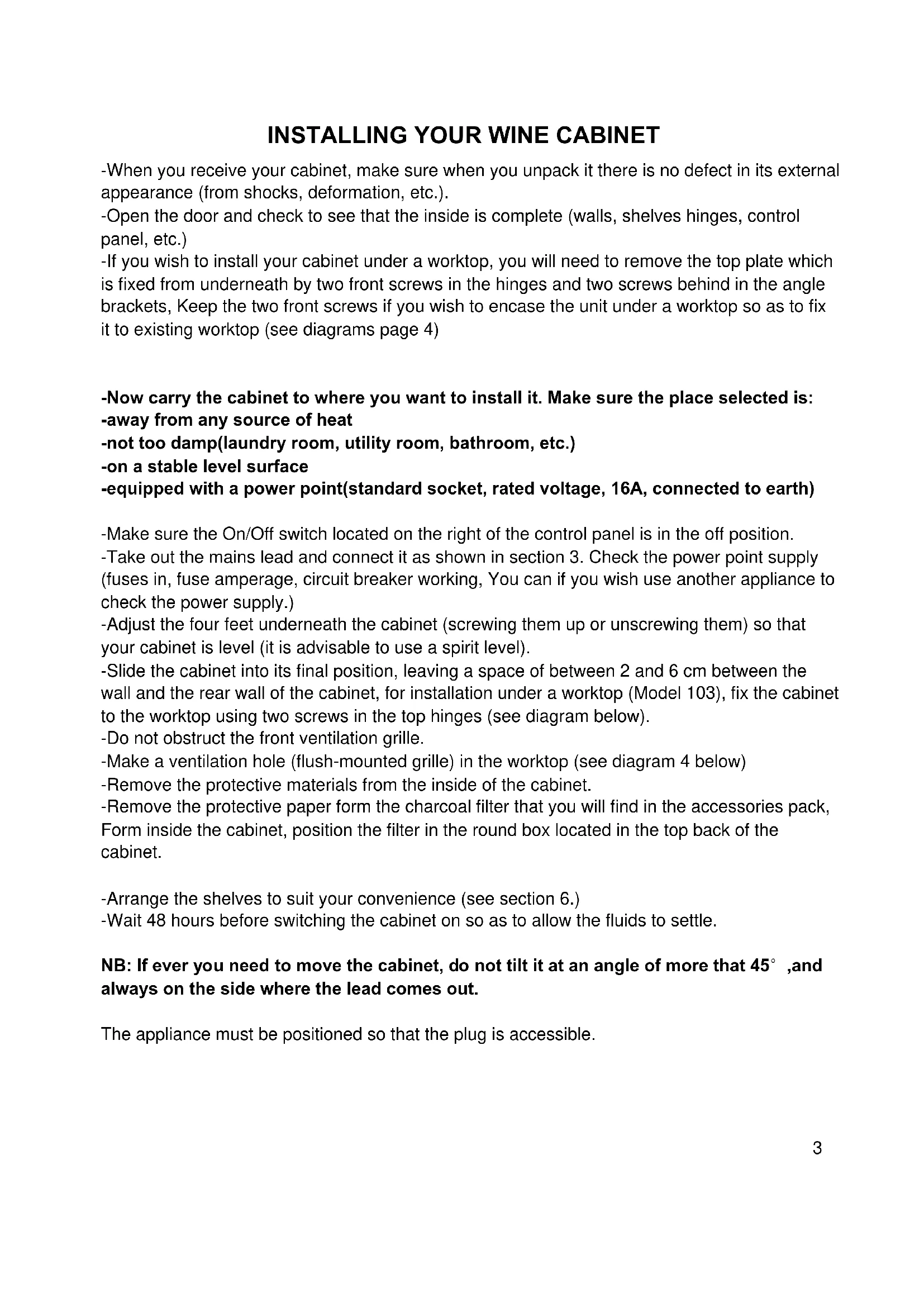 -Now carry the cabinet to where you want to install it. Make sure the place selected is: -away from any source of heat -not too damp(laundry room, utility room, bathroom, etc.) -on a stable level surface -equipped with a power point(standard socket, rated voltage, 16A, connected to earth) -Make sure the On/Off switch located on the right of the control panel is in the off position. -Take out the mains lead and connect it as shown in section 3. Check the power point supply (fuses in, fuse amperage, circuit breaker working, You can if you wish use another appliance to check the power supply.) -Adjust the four feet underneath the cabinet (screwing them up or unscrewing them) so that your cabinet is level (it is advisable to use a spirit level). -Slide the cabinet into its final position, leaving a space of between 2 and 6 cm between the wall and the rear wall of the cabinet, for installation under a worktop (Model 103), fix the cabinet to the worktop using two screws in the top hinges (see diagram below). -Do not obstruct the front ventilation grille. -Make a ventilation hole (flush-mounted grille) in the worktop (see diagram 4 below) -Remove the protective materials from the inside of the cabinet. -Remove the protective paper form the charcoal filter that you will find in the accessories pack, Form inside the cabinet, position the filter in the round box located in the top back of the cabinet. -Arrange the shelves to suit your convenience (see section 6.) -Wait 48 hours before switching the cabinet on so as to allow the fluids to settle. NB: If ever you need to move the cabinet, do not tilt it at an angle of more that 45°,and always on the side where the lead comes out. The appliance must be positioned so that the plug is accessible.