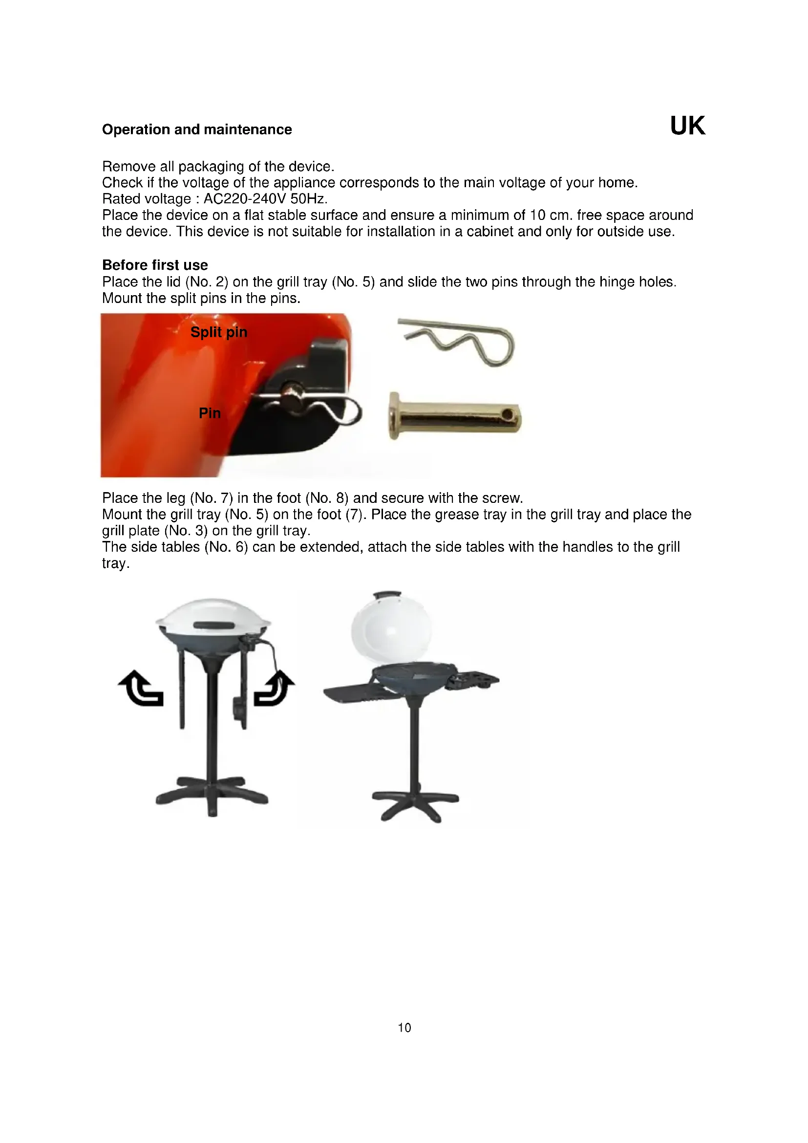 Place the leg (No. 7) in the foot (No. 8) and secure with the screw. Mount the grill tray (No. 5) on the foot (7). Place the grease tray in the grill tray and place the grill plate (No. 3) on the grill tray. The side tables (No. 6) can be extended, attach the side tables with the handles to the grill tray.11 Mount the thermostat holder (no. 9) with the provided screws under the notch in the grill bowl.