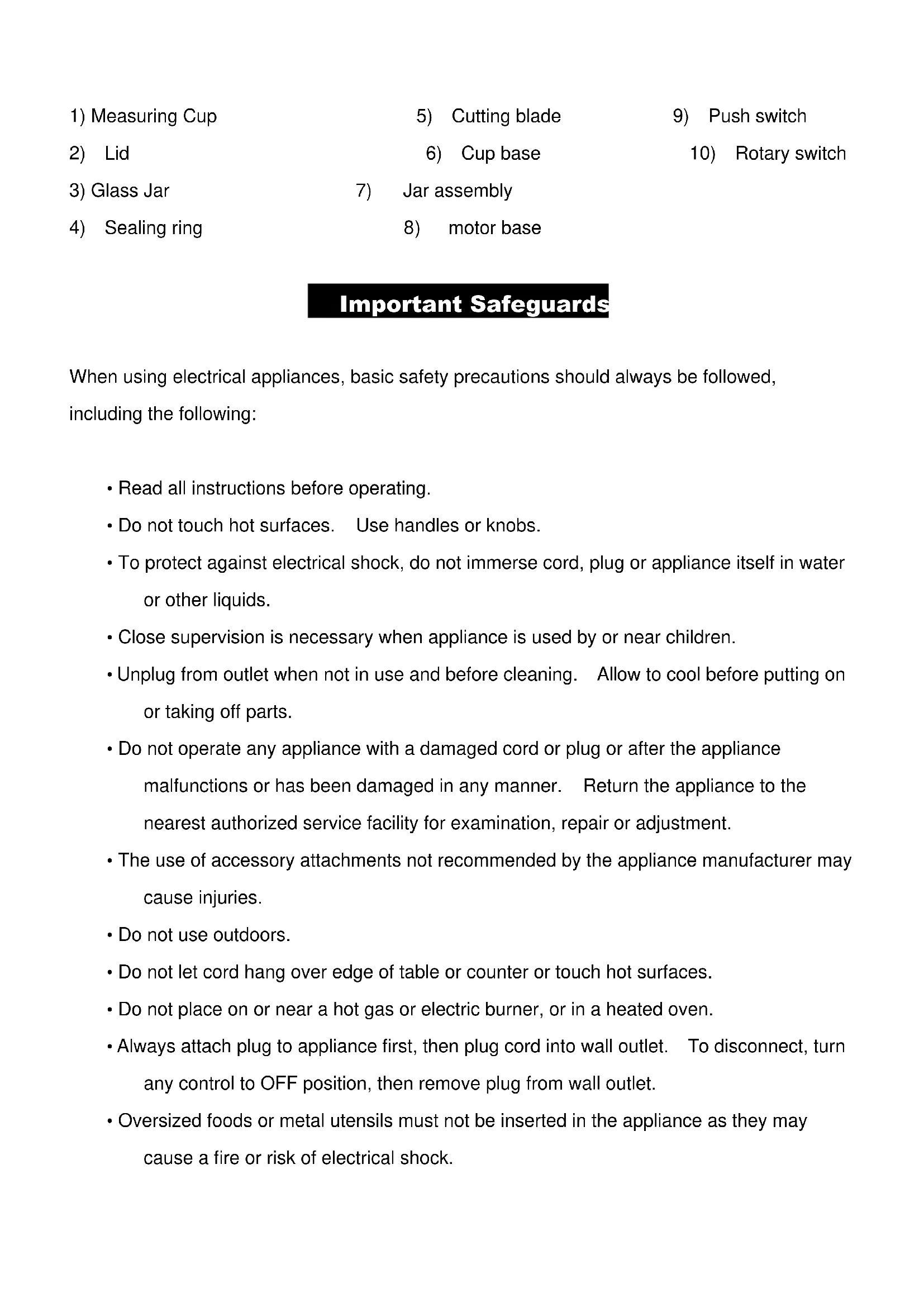 THIS PRODUCT IS FOR HOUSEHOLD USE ONLY! Before first use… All parts of the blender are to be thoroughly cleaned before being used for the first time. (see Section: Cleaning). Take out the required length of cable from the cable tidy on the base of the blender and connect the device to the mains supply. Assembling the Glass Jar: Put the rubber sealing ring (4) on the inner edge of the blade unit (5). Put the blade unit with sealing ring into the cup base (6). Insert the assembled Cup Base onto the bottom of the glass jar and secure tightly. Mount the glass cup (3) onto the cup base unit and tune the cup base unit, and turn clockwise until glass jar locks into place. Mount the Measure Cup (1) onto the Lid (2). Secure the Lid onto Glass Jar and press down.Inserting the Glass Jar: