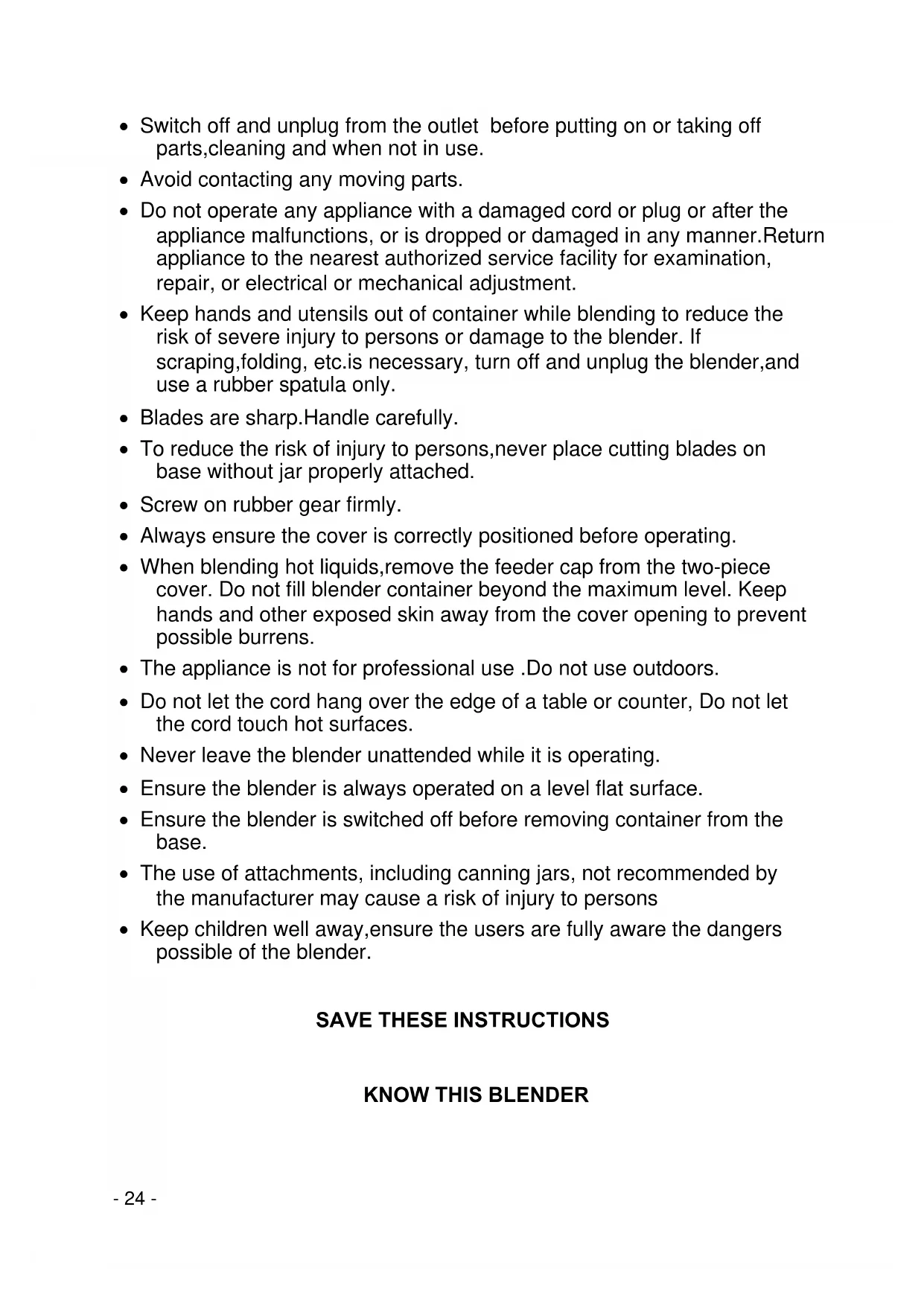 INSTRUCTION Please carefully read these instructions before use 230V/50Hz/200W IMPORTANT SAFEGUARDS When using electrical, basic safety precautions should always be followed, including the following. Read all instructions manual carefully when any appliance is used and keep them in a safe place. To protect against risk of electrical shock, do not immerse base assembly ,or cord in water or other liquid. Close supervision is necessary when any appliance is used by or near children.- 24 - Switch off and unplug from the outlet before putting on or taking off parts,cleaning and when not in use. Avoid contacting any moving parts. Do not operate any appliance with a damaged cord or plug or after the appliance malfunctions, or is dropped or damaged in any manner.Return appliance to the nearest authorized service facility for examination, repair, or electrical or mechanical adjustment. Keep hands and utensils out of container while blending to reduce the risk of severe injury to persons or damage to the blender. If scraping,folding, etc.is necessary, turn off and unplug the blender,and use a rubber spatula only. Blades are sharp.Handle carefully. To reduce the risk of injury to persons,never place cutting blades on base without jar properly attached. Screw on rubber gear firmly. Always ensure the cover is correctly positioned before operating. When blending hot liquids,remove the feeder cap from the two-piece cover. Do not fill blender container beyond the maximum level. Keep hands and other exposed skin away from the cover opening to prevent possible burrens. The appliance is not for professional use .Do not use outdoors. Do not let the cord hang over the edge of a table or counter, Do not let the cord touch hot surfaces. Never leave the blender unattended while it is operating. Ensure the blender is always operated on a level flat surface. Ensure the blender is switched off before removing container from the base. The use of attachments, including canning jars, not recommended by the manufacturer may cause a risk of injury to persons Keep children well away,ensure the users are fully aware the dangers possible of the blender.