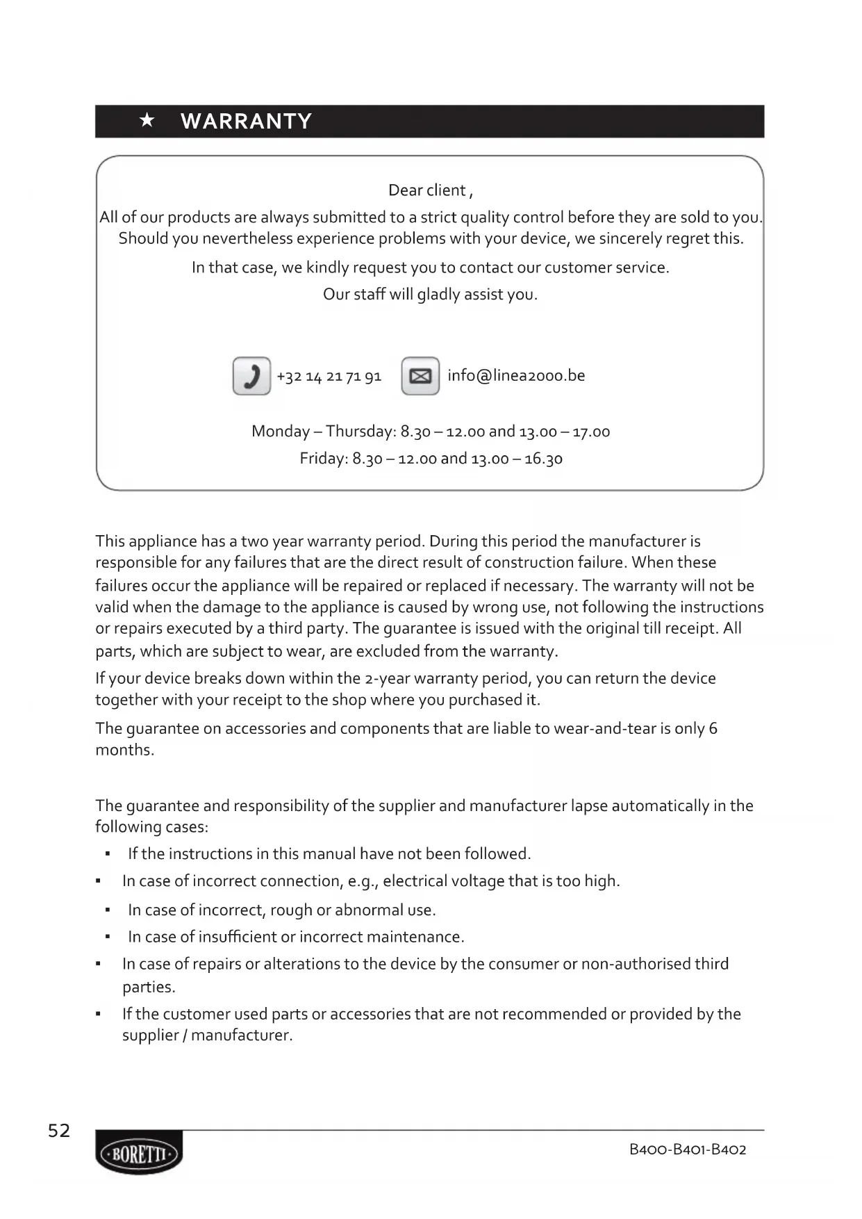 - Do not leave the appliance on unattended.56 B400-B401-B402 Bernini www.boretti.com Gebruiksaanwijzing NL Mode d’emploi FR De Dollard 17, 1454 AT Watergang T + 31 (0) 20 - 436 34 39, F +31 (0) 20 - 436 13 26 W www.boretti.com E info@boretti.com T +32 (0)3 450 81 80, F +32 (0)3 458 68 47W www.boretti.beE info@boretti.be Boretti - The Netherlands Boretti - Belgiumwww.boretti.com BORETTI0086 Cover Gebruiksaanwijzingen_v4.indd 3-4 06-11-15 16:33