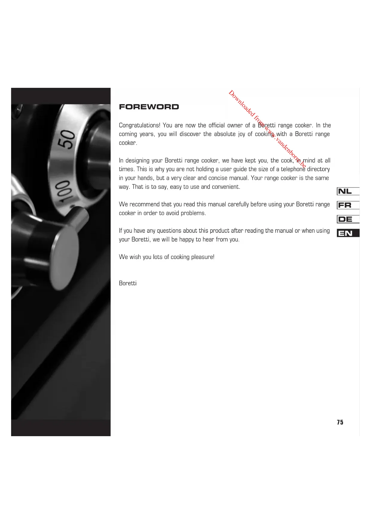 Before First Use Safety Instructions This manual is part of the range cooker. It must be kept nearby during the entire lifespan of the range cooker. We recommend reading this manual carefully be- fore using the range cooker. The range cooker must be installed by a qualified technician in compliance with installation instruc- tions as described in the previous chapter. This range cooker is suitable for household use, and complies with current EU guidelines. The range cooker has been manufactured to cook and bake foods. Boretti is not liable for unaut- horized use of the appliance, such as heating up a space. Never block the openings and slots of your Bo- retti, so that proper ventilation is ensured. This also applies to the air vents on the top/back of the cooktop, however, only in case of a ventilated gas oven. Immediately after installation, the range cooker should be thoroughly tested, and any malfuncti- ons reported. Never place pans or objects on the range coo- ker if they do not have a smooth and flat bottom surface. Never place combustible products in your oven. Unexpected ignition could result in fire. The range cooker is designed for use by adults – never allow children to remain near the range cooker unsupervised. Certain parts such as the grill element can beco- me extremely hot. Therefore do not allow children to play or be near the range cooker. After every use, verify that all control knobs are set to “off”. In case of doubt regarding the safety instructions of your Boretti, we urgently recommend that you call Boretti. You will find our phone numbers on the back of this manual. Do not use parchment paper when grilling. Never put combustible objects or products that could melt at low temperatures in the storage space below the oven. Environmental Regulations Never leave packaging unsupervised. Separate the various packing materials by type, and take them to the nearest waste sorting station in your municipality. We use non–polluting and therefore environmen- tally–friendly and recyclable materials for the pac- kaging of our products. We ask for your coope- ration in making sure that the packing materials are processed properly. Addresses for collection, recycling and processing centers are available at your dealer or the appropriate local institutions. Never simply dump packaging or parts of it. This could be a choking hazard for children, particu- larly the plastic bags. You are also responsible for proper processing of the old appliance. Important: take the appliance to a local company authorized to collect discarded household applian- ces. With proper processing, valuable materials can be recycled in an intelligent fashion. Before you dispose of your appliance, it is important that you remove the door, and leave the racks in func- tional position in order to avoid children getting shut into the oven cavity while playing. Downloaded from www.vandenborre.be80 In addition, you should cut off the electrical power cord, and remove it together with the plug. The guidelines determine standards for collection and recycling of discarded appliances which apply to the entire European Union. Cleaning Before First Use It is recommended to thoroughly remove all pac- kaging residue from the range cooker, followed by cleaning according to the guidelines. Before first use of the oven, you should heat the oven at full power for 30 minutes. An unpleasant scorching smell will develop during this initial heating. This is normal. We recommend that you ventilate the kitchen area thoroughly during initial heating. Downloaded from www.vandenborre.be81