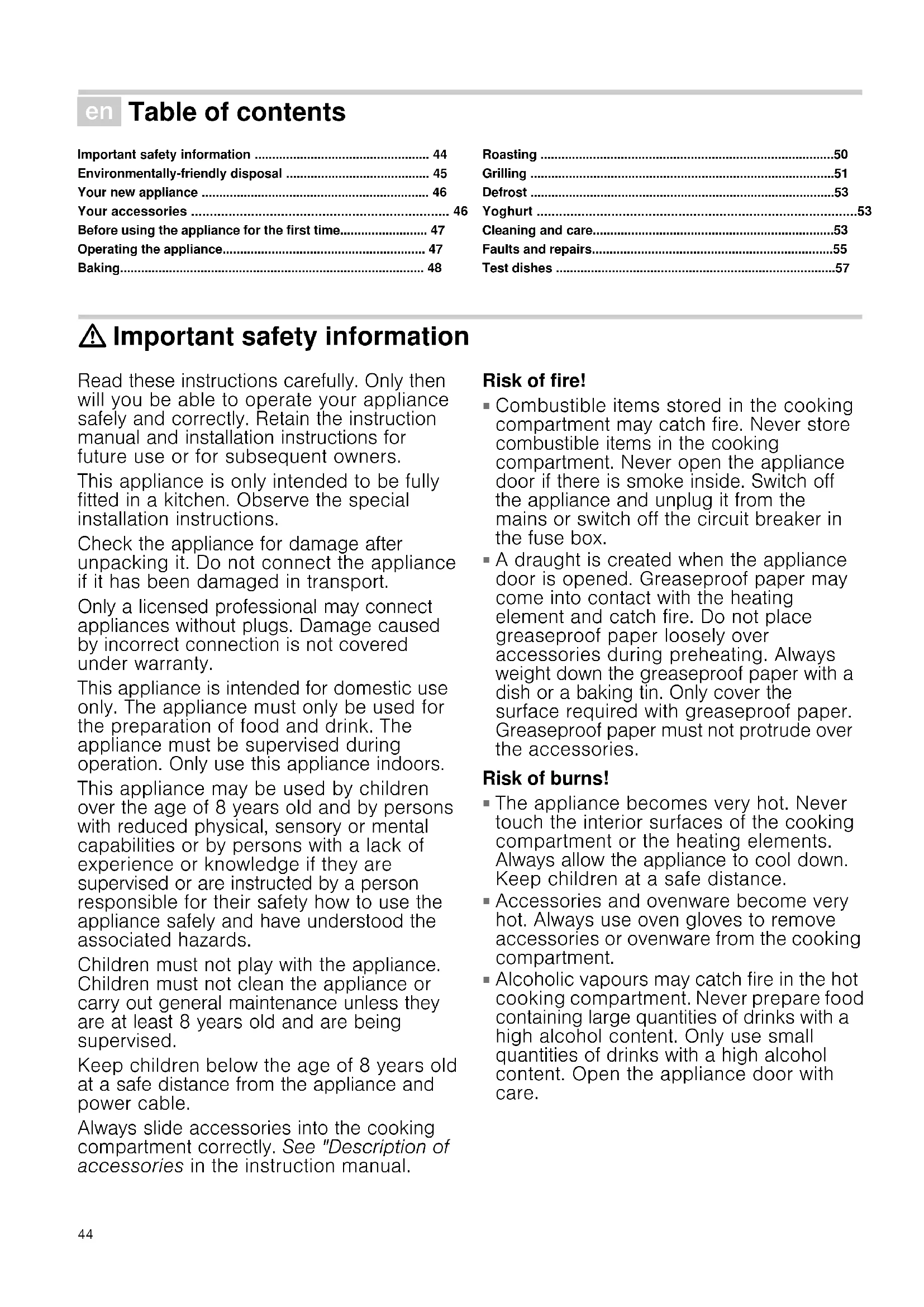 - 10 minuten voorverwarmen ** na Z van de tijd keren44 Ú Table of contents [en]Instruction manual Important safety information .................................................. 44 Environmentally-friendly disposal ......................................... 45 Your new appliance ................................................................. 46 Your accessories ..................................................................... 46 Before using the appliance for the first time......................... 47 Operating the appliance.......................................................... 47 Baking....................................................................................... 48 Roasting ....................................................................................50 Grilling .......................................................................................51 Defrost .......................................................................................53 Yoghurt ......................................................................................53 Cleaning and care.....................................................................53 Faults and repairs.....................................................................55 Test dishes ................................................................................57 : Important safety information Read these instructions carefully. Only then will you be able to operate your appliance safely and correctly. Retain the instruction manual and installation instructions for future use or for subsequent owners. This appliance is only intended to be fully fitted in a kitchen. Observe the special installation instructions. Check the appliance for damage after unpacking it. Do not connect the appliance if it has been damaged in transport. Only a licensed professional may connect appliances without plugs. Damage caused by incorrect connection is not covered under warranty. This appliance is intended for domestic use only. The appliance must only be used for the preparation of food and drink. The appliance must be supervised during operation. Only use this appliance indoors. This appliance may be used by children over the age of 8 years old and by persons with reduced physical, sensory or mental capabilities or by persons with a lack of experience or knowledge if they are supervised or are instructed by a person responsible for their safety how to use the appliance safely and have understood the associated hazards. Children must not play with the appliance. Children must not clean the appliance or carry out general maintenance unless they are at least 8 years old and are being supervised. Keep children below the age of 8 years old at a safe distance from the appliance and power cable. Always slide accessories into the cooking compartment correctly. See "Description of accessories in the instruction manual. Risk of fire!