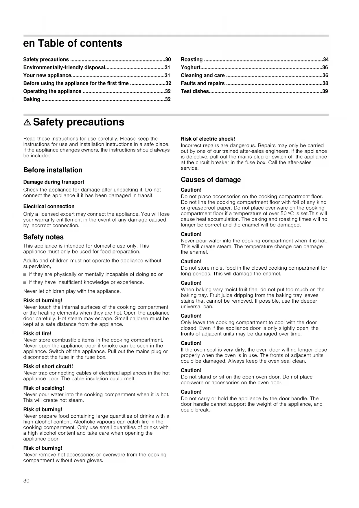 - Oven voorverwarmen **10 minuten voorverwarmen ***Plaatstaal gebruiken30 en Table of contents Safety precautions ...................................................................30 Environmentally-friendly disposal..........................................31 Your new appliance..................................................................31 Before using the appliance for the first time .........................32 Operating the appliance ..........................................................32 Baking .......................................................................................32 Roasting ....................................................................................34 Yoghurt......................................................................................36 Cleaning and care ....................................................................36 Faults and repairs ....................................................................38 Test dishes................................................................................39 m Safety precautions Read these instructions for use carefully. Please keep the instructions for use and installation instructions in a safe place. If the appliance changes owners, the instructions should always be included. Before installation Damage during transport Check the appliance for damage after unpacking it. Do not connect the appliance if it has been damaged in transit. Electrical connection Only a licensed expert may connect the appliance. You will lose your warranty entitlement in the event of any damage caused by incorrect connection. Safety notes This appliance is intended for domestic use only. This appliance must only be used for food preparation. Adults and children must not operate the appliance without supervision, ■ if they are physically or mentally incapable of doing so or ■ if they have insufficient knowledge or experience. Never let children play with the appliance. Risk of burning! Never touch the internal surfaces of the cooking compartment or the heating elements when they are hot. Open the appliance door carefully. Hot steam may escape. Small children must be kept at a safe distance from the appliance. Risk of fire! Never store combustible items in the cooking compartment. Never open the appliance door if smoke can be seen in the appliance. Switch off the appliance. Pull out the mains plug or disconnect the fuse in the fuse box. Risk of short circuit! Never trap connecting cables of electrical appliances in the hot appliance door. The cable insulation could melt. Risk of scalding! Never pour water into the cooking compartment when it is hot. This will create hot steam. Risk of burning! Never prepare food containing large quantities of drinks with a high alcohol content. Alcoholic vapours can catch fire in the cooking compartment. Only use small quantities of drinks with a high alcohol content and take care when opening the appliance door. Risk of burning! Never remove hot accessories or ovenware from the cooking compartment without oven gloves. Risk of electric shock! Incorrect repairs are dangerous. Repairs may only be carried out by one of our trained aftersales engineers. If the appliance is defective, pull out the mains plug or switch off the appliance at the circuit breaker in the fuse box. Call the aftersales service. Causes of damage Caution! Do not place accessories on the cooking compartment floor. Do not line the cooking compartment floor with foil of any kind or greaseproof paper. Do not place ovenware on the cooking compartment floor if a temperature of over 50 ºC is set.This will cause heat accumulation. The baking and roasting times will no longer be correct and the enamel will be damaged. Caution! Never pour water into the cooking compartment when it is hot. This will create steam. The temperature change can damage the enamel. Caution! Do not store moist food in the closed cooking compartment for long periods. This will damage the enamel. Caution! When baking very moist fruit flan, do not put too much on the baking tray. Fruit juice dripping from the baking tray leaves stains that cannot be removed. If possible, use the deeper universal pan. Caution! Only leave the cooking compartment to cool with the door closed. Even if the appliance door is only slightly open, the fronts of adjacent units may be damaged over time. Caution! If the oven seal is very dirty, the oven door will no longer close properly when the oven is in use. The fronts of adjacent units could be damaged. Always keep the oven seal clean. Caution! Do not stand or sit on the open oven door. Do not place cookware or accessories on the oven door. Caution! Do not carry or hold the appliance by the door handle. The door handle cannot support the weight of the appliance, and could break.31 Environmentally-friendly disposal Dispose of packaging in an environmentally-friendly manner. The directive gives a framework for the collection and recycling of old appliances, which is valid across the EU. Your new appliance In this section you will find information on the appliance, the operating modes and the accessories. Control panel Operating modes Shelf heights The cooking compartment has four shelf heights. The shelf heights are counted from the bottom up. Accessories The following accessories are supplied with your appliance: You can obtain further accessories from specialist retailers: This appliance is labelled in accordance with European Directive 2002/96/EC on Waste Electrical and Electronic Equipment WEEE. Control element Use Operating mode and temperature selector Selects the operating mode and temperature Control knobs for hotplates ï indicator lamp is not lit: hotplates off ï indicator lamp lit: at least one hotplate is on Operating modes Application Top/bottom heat 50 - 270 °C for baking and roasting. Especially suitable for cakes with moist toppings (e.g. cheesecake) # Top heating for food and baked goods which should form 