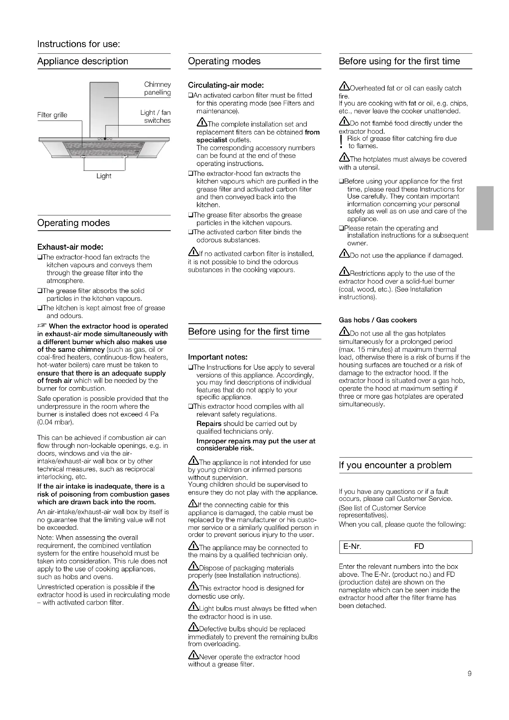 efore using for the first time If you encounter a problem If you have any questions or if a faultoccurs, please call Customer Service. (See list of Customer Service representatives).When you call, please quote the following: E-Nr. FD Enter the relevant numbers into the boxabove. The E-Nr. (product no.) and FD(production date) are shown on the nameplate which can be seen inside theextractor hood after the filter frame hasbeen detached.Important notes:q The Instructions for Use apply to severalversions of this appliance. Accordingly,you may find descriptions of individualfeatures that do not apply to your specific appliance.q This extractor hood complies with all relevant safety regulations.Repairs should be carried out by qualified technicians only.Improper repairs may put the user atconsiderable risk.q Before using your appliance for the firsttime, please read these Instructions forUse carefully. They contain importantinformation concerning your personalsafety as well as on use and care of theappliance.q Please retain the operating and installation instructions for a subsequentowner. 몇 Do not use the appliance if damaged. 몇 The appliance is not intended for use by young children or infirmed persons without supervision.Young children should be supervised toensure they do not play with the appliance. 몇 If the connecting cable for this appliance is damaged, the cable must bereplaced by the manufacturer or his custo-mer service or a similarly qualified person inorder to prevent serious injury to the user. 몇 The appliance may be connected to the mains by a qualified technician only. 몇 Dispose of packaging materials properly (see Installation instructions). 몇 This extractor hood is designed for domestic use only. 몇 Light bulbs must always be fitted when the extractor hood is in use. 몇 Defective bulbs should be replaced immediately to prevent the remaining bulbsfrom overloading. 몇 Never operate the extractor hood without a grease filter. 몇 Restrictions apply to the use of the extractor hood over a solid-fuel burner(coal, wood, etc.). (See Installation instructions).Gas hobs / Gas cookers 몇 Do not use all the gas hotplates simultaneously for a prolonged period (max. 15 minutes) at maximum thermalload, otherwise there is a risk of burns if thehousing surfaces are touched or a risk ofdamage to the extractor hood. If the extractor hood is situated over a gas hob,operate the hood at maximum setting ifthree or more gas hotplates are operatedsimultaneously. 몇 Overheated fat or oil can easily catch fire. If you are cooking with fat or oil, e.g. chips,etc., never leave the cooker unattended. 몇 Do not flambé food directly under the extractor hood.Risk of grease filter catching fire due ! to flames. 몇 The hotplates must always be covered with a utensil.10