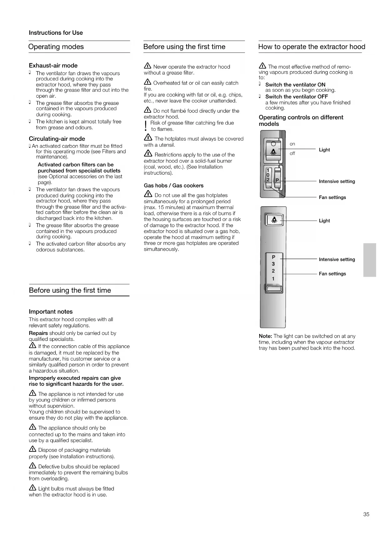 The ventilator fan draws the vapoursproduced during cooking into the extractor hood, where they passthrough the grease filter and out into theopen air. The grease filter absorbs the greasecontained in the vapours producedduring cooking. The kitchen is kept almost totally freefrom grease and odours. Circulating-air mode q An activated carbon filter must be fittedfor this operating mode (see Filters andmaintenance).Activated carbon filters can be purchased from specialist outlets (see Optional accessories on the last page). The ventilator fan draws the vapoursproduced during cooking into the extractor hood, where they passthrough the grease filter and the activa-ted carbon filter before the clean air isdischarged back into the kitchen. The grease filter absorbs the greasecontained in the vapours producedduring cooking. The activated carbon filter absorbs anyodorous substances. Before using the first time Important notes This extractor hood complies with all relevant safety regulations.Repairs should only be carried out by qualified specialists. If the connection cable of this appliance is damaged, it must be replaced by themanufacturer, his customer service or asimilarly qualified person in order to preventa hazardous situation.Improperly executed repairs can giverise to significant hazards for the user. The appliance is not intended for use by young children or infirmed persons without supervision.Young children should be supervised toensure they do not play with the appliance. The appliance should only be connected up to the mains and taken intouse by a qualified specialist. Dispose of packaging materials properly (see Installation instructions). Defective bulbs should be replaced immediately to prevent the remaining bulbsfrom overloading. Light bulbs must always be fitted when the extractor hood is in use. Operating modes Instructions for Use Before using the first time The most effective method of remo- ving vapours produced during cooking is to: